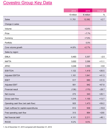 下圖是關于科思創公司2015財年報告的關鍵數據: