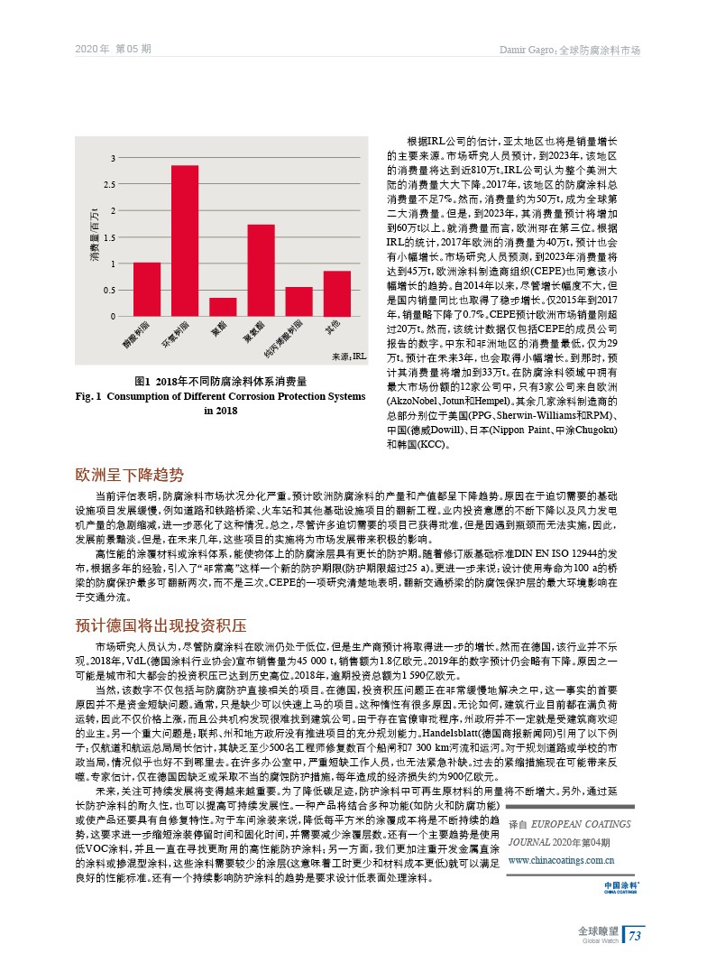 摘要:編者按:防腐涂料的需求量受公共基礎(chǔ)設(shè)施支出的影響很大。目前,許多項目都處于停滯狀態(tài),因此,當(dāng)前消費量并不反映實際的需求。但是,正如市場研究公司IRL預(yù)測的那樣,在未來幾年中,該市場會取得更加積極的發(fā)展。
