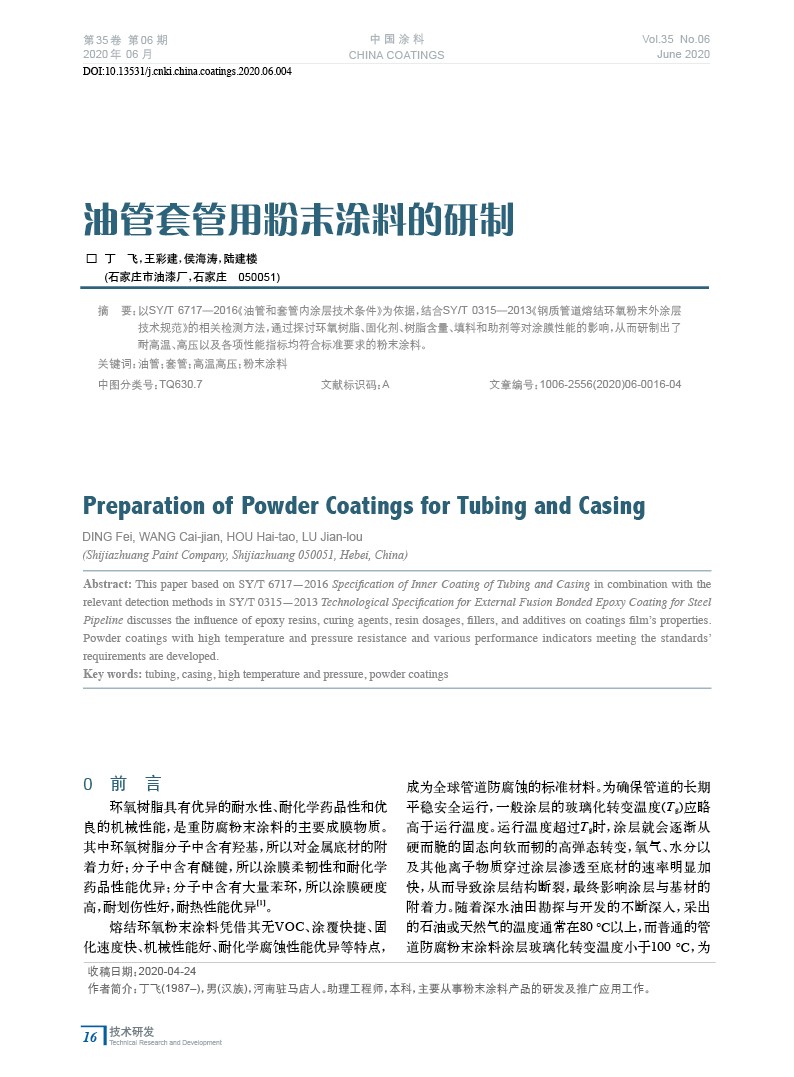 摘要:以SY/T 6717—2016《油管和套管內(nèi)涂層技術(shù)條件》為依據(jù),結(jié)合SY/T 0315—2013《鋼質(zhì)管道熔結(jié)環(huán)氧粉末外涂層技術(shù)規(guī)范》的相關(guān)檢測方法,通過探討環(huán)氧樹脂、固化劑、樹脂含量、填料和助劑等對涂膜性能的影響,從而研制出了耐高溫、高壓以及各項(xiàng)性能指標(biāo)均符合標(biāo)準(zhǔn)要求的粉末涂料。