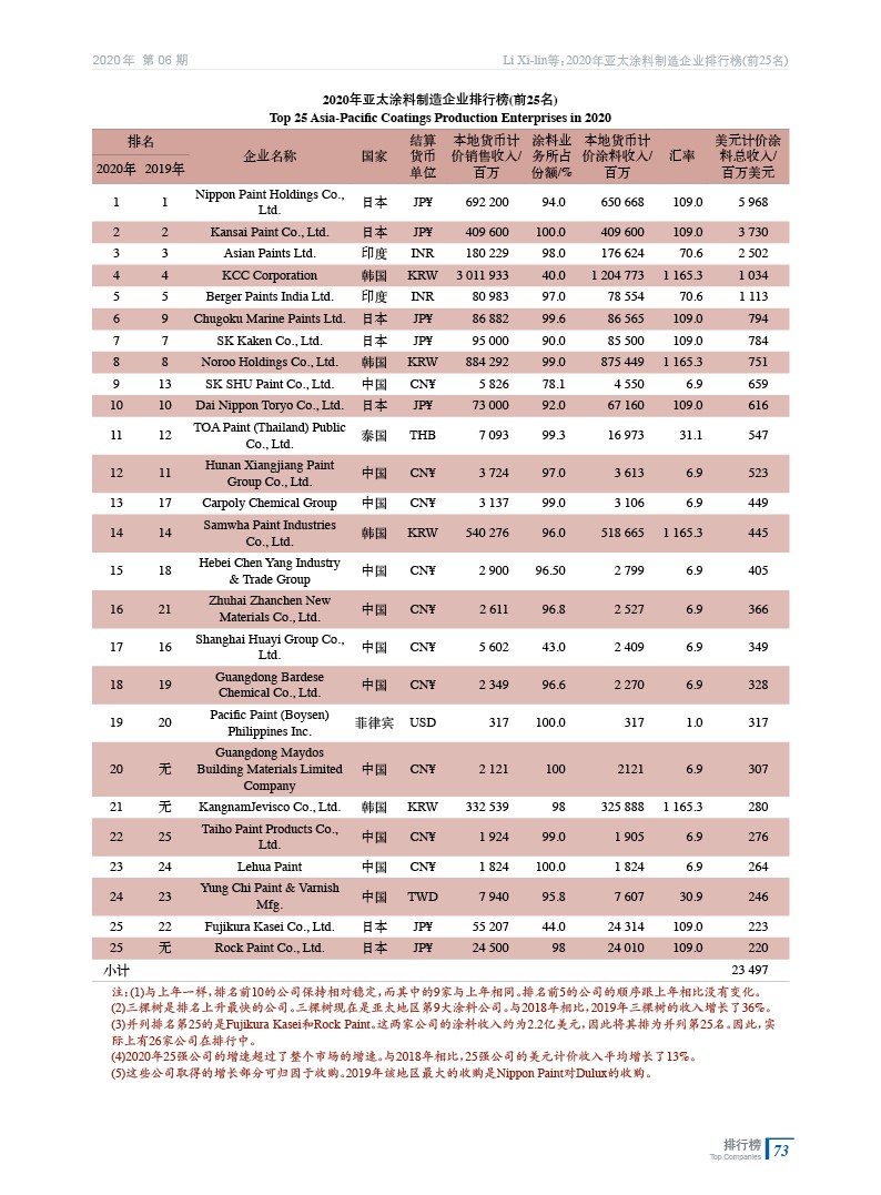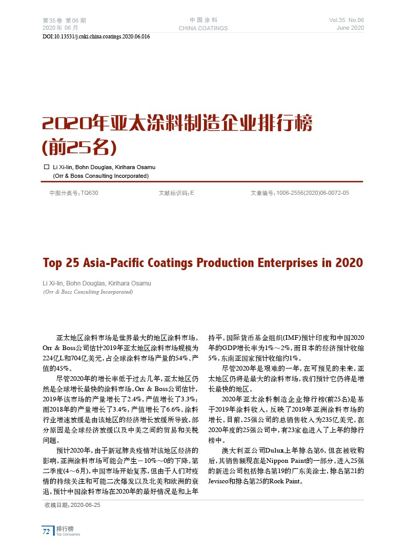 2020年亞太涂料制造企業排行榜(前25名)
