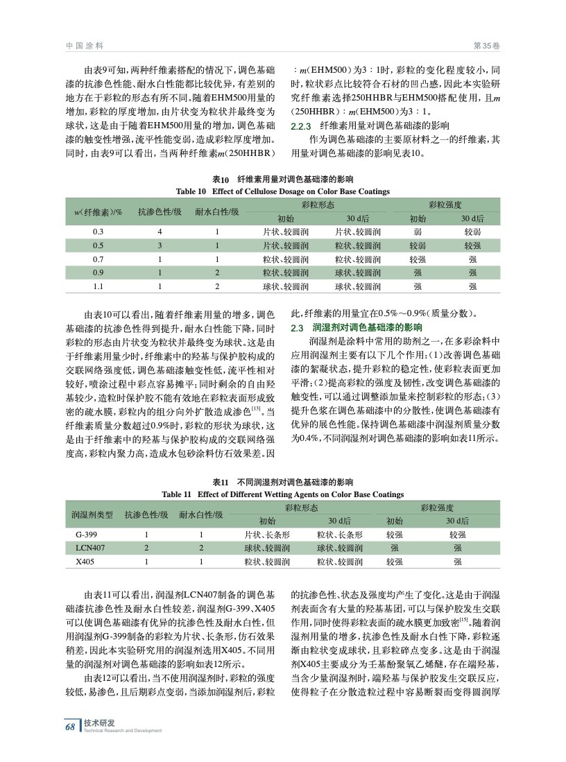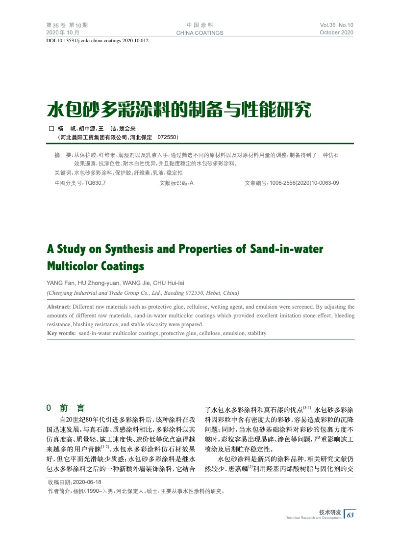 摘要:從保護(hù)膠、纖維素、潤(rùn)濕劑以及乳液入手,通過(guò)篩選不同的原材料以及對(duì)原材料用量的調(diào)整,制備得到了一種仿石效果逼真,抗?jié)B色性、耐水白性優(yōu)異,并且黏度穩(wěn)定的水包砂多彩涂料。