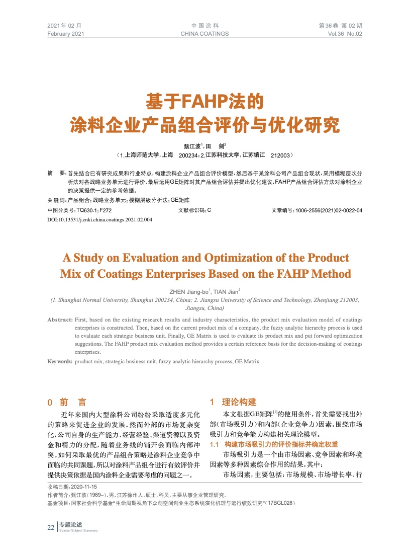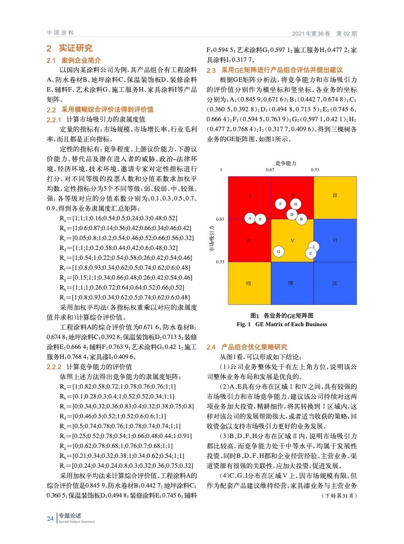 首先結合已有研究成果和行業特點,構建涂料企業產品組合評價模型,然后基于某涂料公司產品組合現狀,采用模糊層次分析法對各戰略業務單元進行評價,最后運用GE矩陣對其產品組合評估并提出優化建議,FAHP產品組合評估方法對涂料企業的決策提供一定的參考依據。