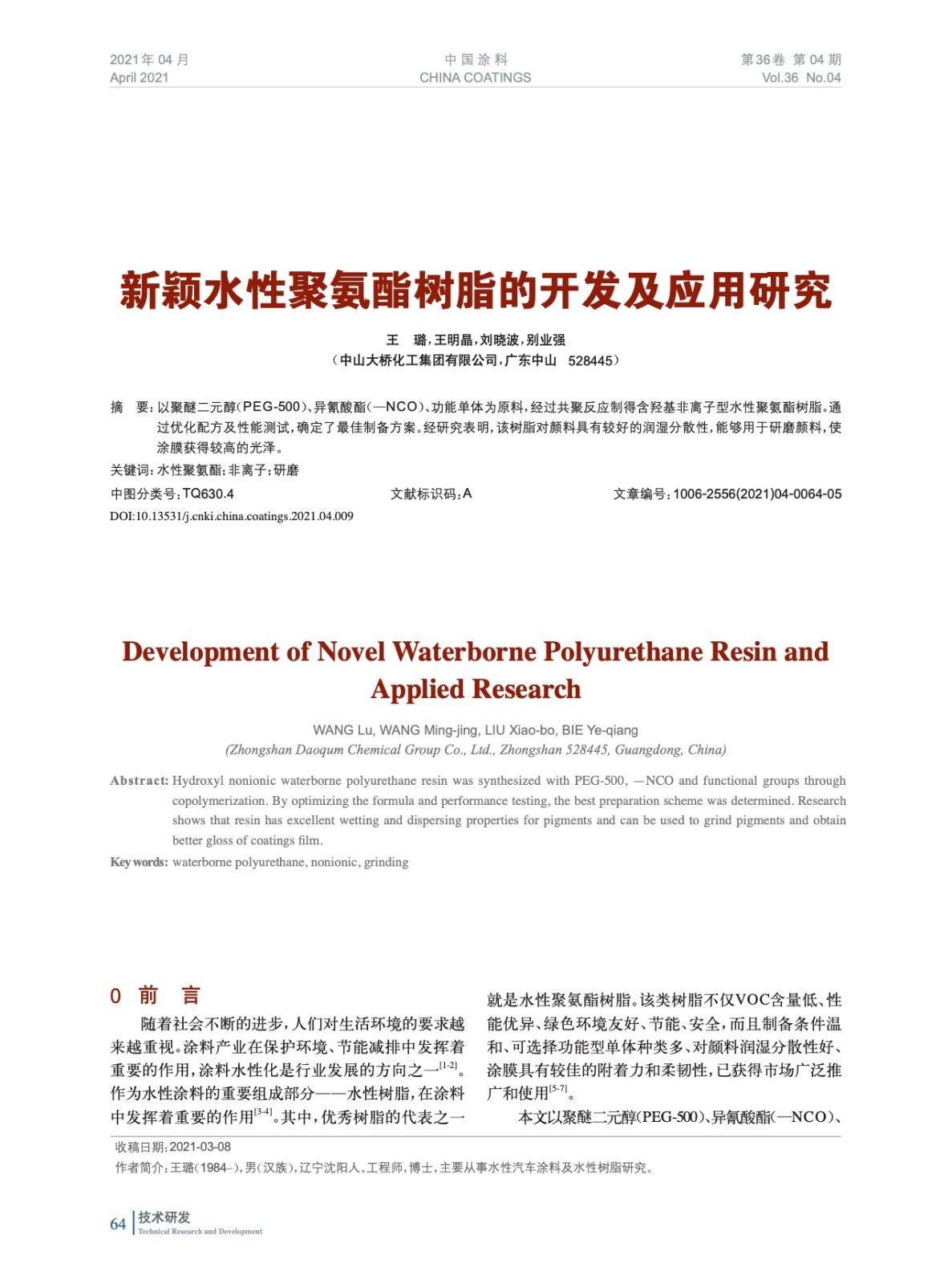 摘要:以聚醚二元醇、異氰酸酯、功能單體為原料,經(jīng)過共聚反應(yīng)制得含羥基非離子型水性聚氨酯樹脂。通過優(yōu)化配方及性能測(cè)試,確定了最佳制備方案。經(jīng)研究表明,該樹脂對(duì)顏料具有較好的潤(rùn)濕分散性,能夠用于研磨顏料,使涂膜獲得較高的光澤。