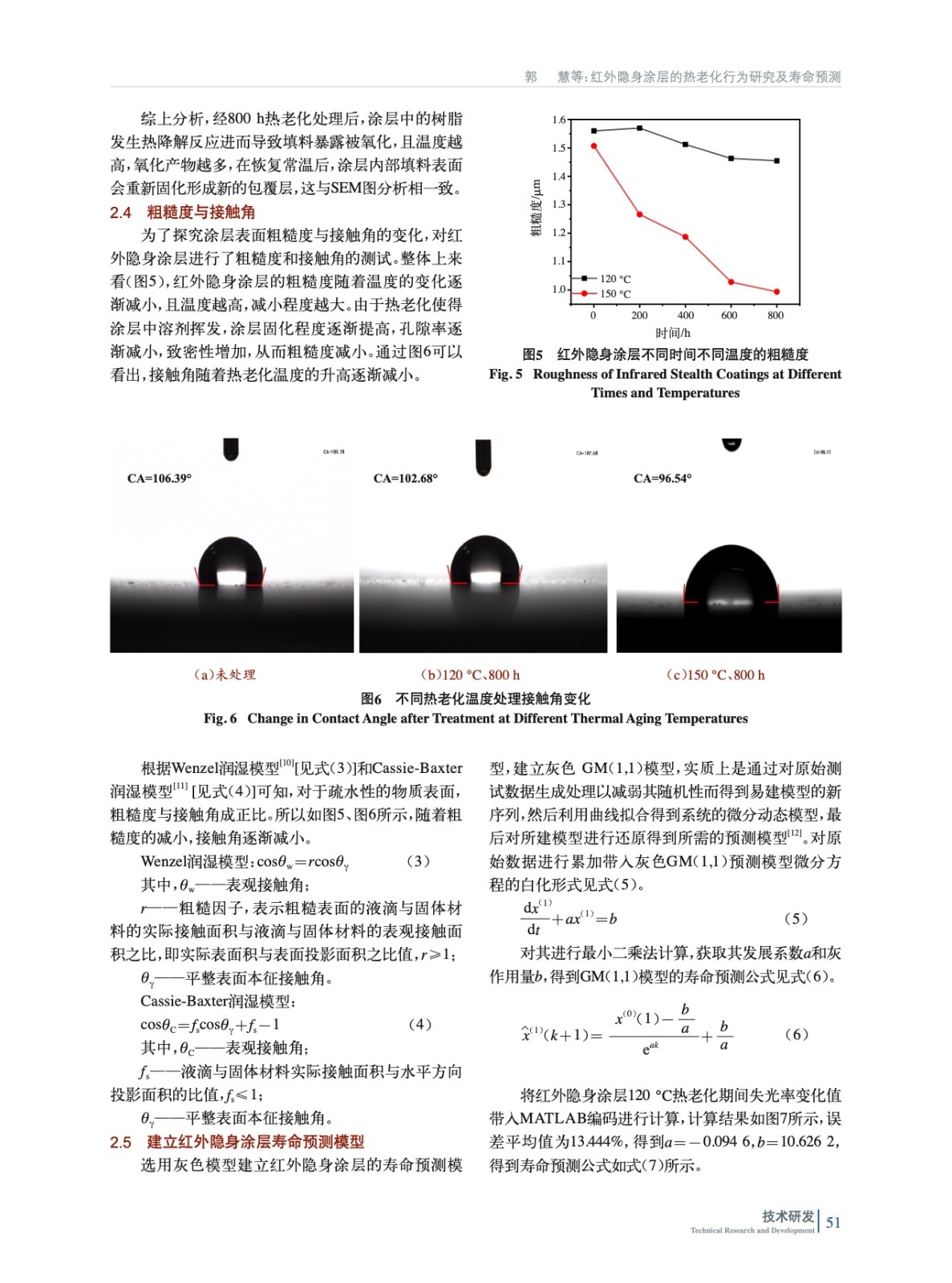 摘要:研究了熱老化對實驗室自制紅外隱身涂層性能的影響規律,建立了相應的壽命預測模型。結果表明,隨著熱老化時間的延長,涂層中鋁粉出現熱氧化,高分子樹脂發生熱分解;隨著熱老化溫度的上升,引起表面結構改變,導致粗糙度下降,接觸角下降。最后,根據紅外隱身涂層熱老化試驗的光澤度值,應用灰色模型實現對紅外隱身涂層使用壽命的準確預測,誤差平均值為13.444%。