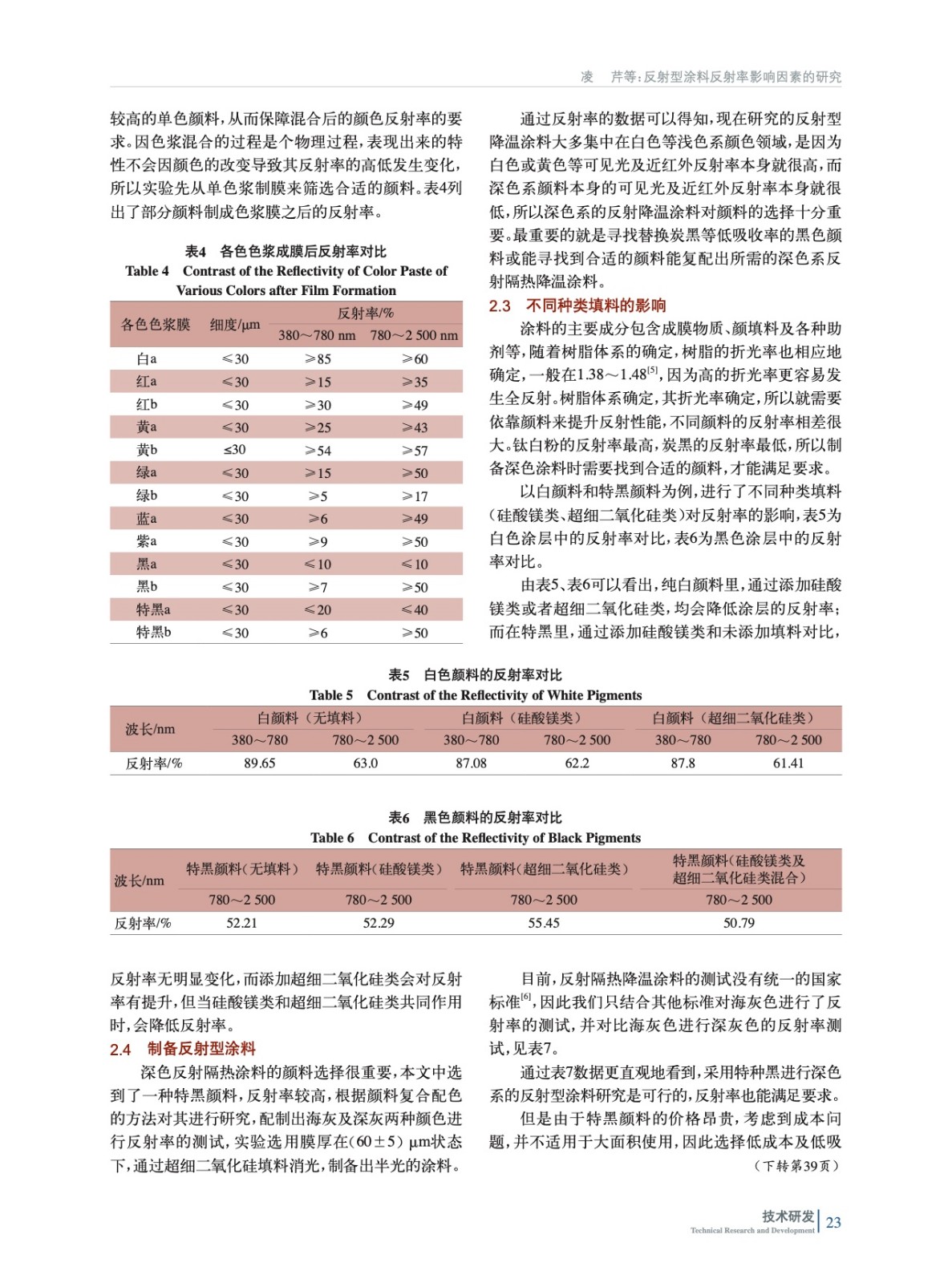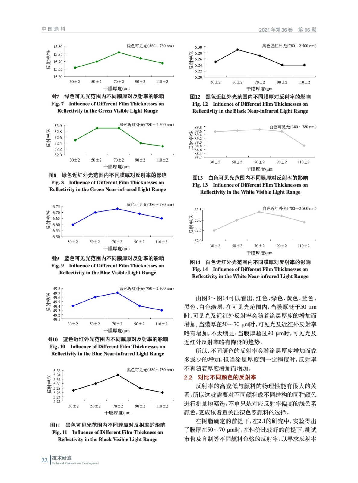 反射型涂料對金屬基材內部的降溫作用是很多密閉裝備或建筑所需求的,反射率是影響降溫效果的主要評價指標。重點討論了不同顏填料的反射率及不同膜厚下反射率的變化,并基于以上研究制備出了兩種深色系反射型涂料,已應用于某些密閉裝備金屬表面涂裝,取得了良好效果。
