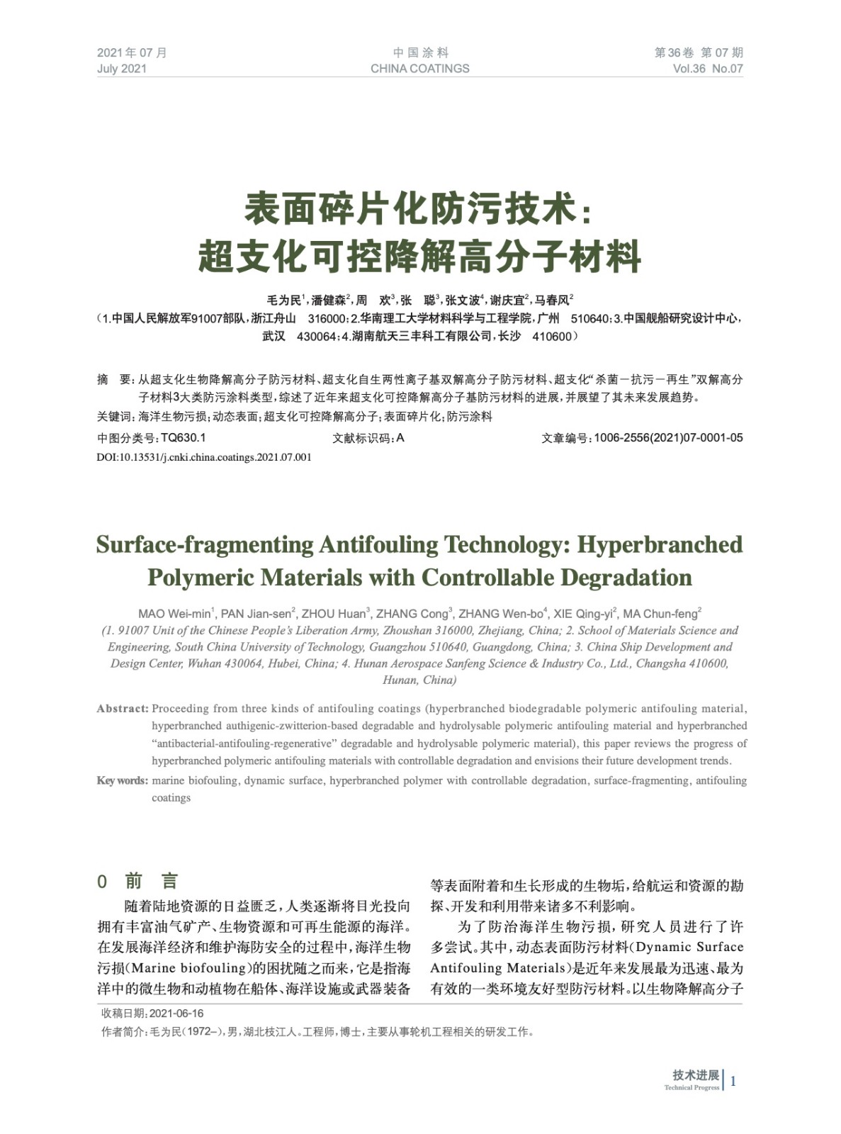 摘要:從超支化生物降解高分子防污材料、超支化自生兩性離子基雙解高分子防污材料、超支化“殺菌-抗污-再生”雙解高分子材料3大類防污涂料類型,綜述了近年來超支化可控降解高分子基防污材料的進(jìn)展,并展望了其未來發(fā)展趨勢。