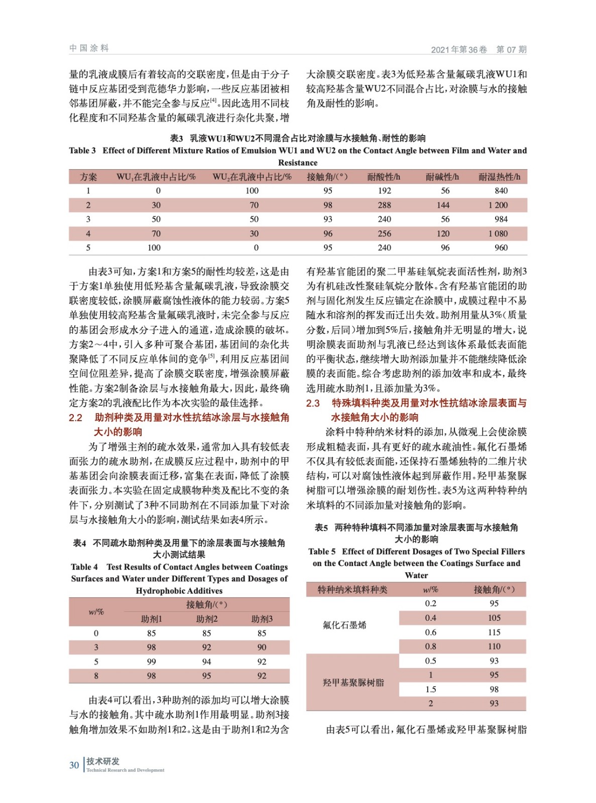 摘要:制備了一種風(fēng)電葉片用水性抗結(jié)冰涂料,考察了成膜物種類及配比、疏水助劑、特種填料對(duì)水性抗結(jié)冰涂料性能的影響。結(jié)果表明:采用氟碳乳液WU1/WU2為主體,以3︰7比例作為成膜物,添加3%(質(zhì)量分?jǐn)?shù),后同)聚二甲基硅氧烷類疏水助劑,并添加0.6%氟化石墨烯,制備的抗結(jié)冰涂料的抗結(jié)冰性能最好。