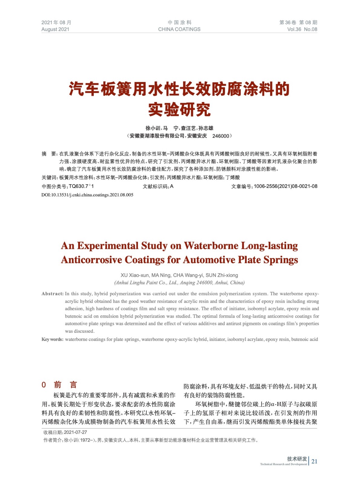 本文系作者@徐小訓(xùn),馬 寧,查汪藝,孫志雄 授權(quán)中國(guó)涂料網(wǎng)發(fā)表,并經(jīng)中國(guó)涂料網(wǎng)編輯,未經(jīng)允許不得轉(zhuǎn)載,如需轉(zhuǎn)載請(qǐng)聯(lián)系chinacoatingnet@vip.163.com