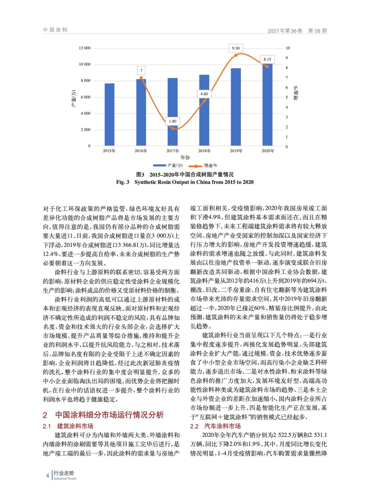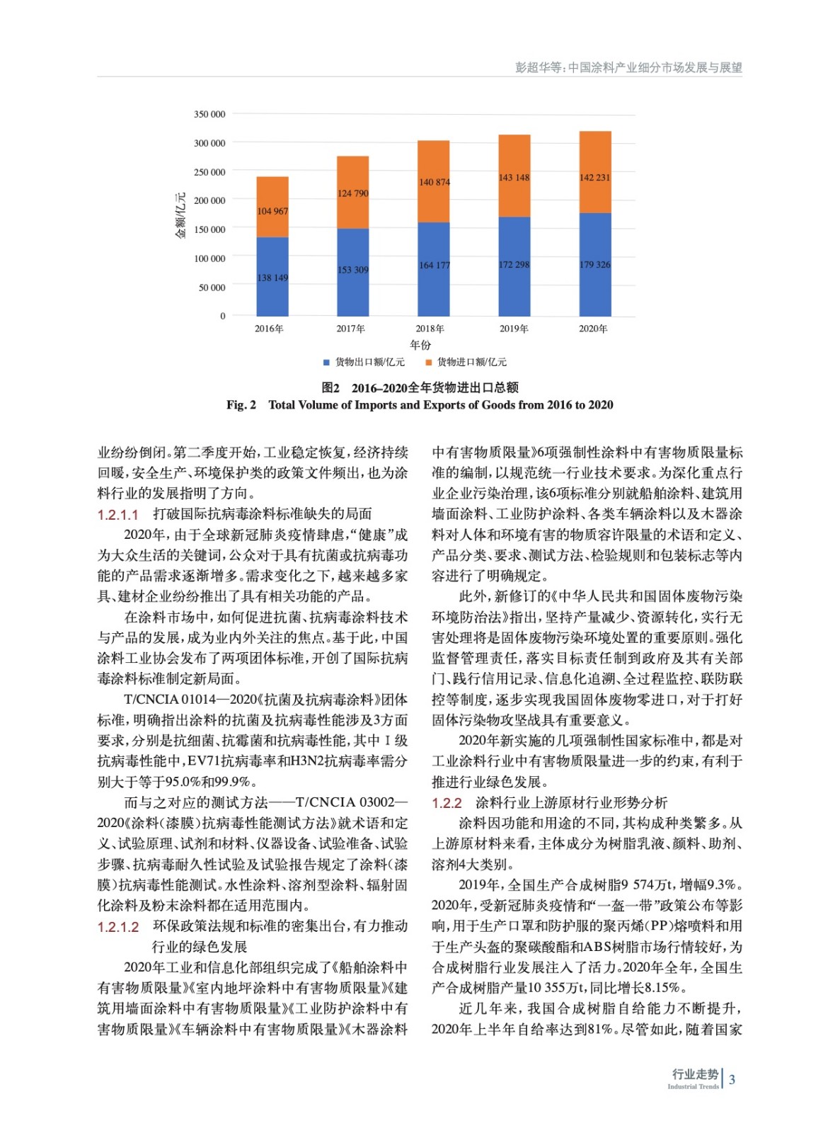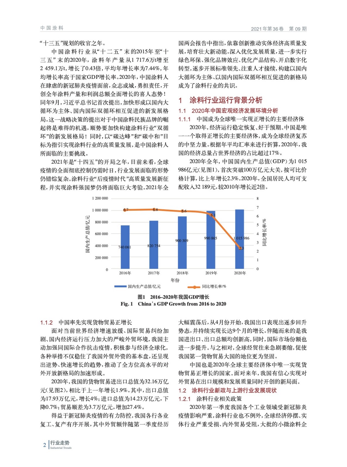 摘要:概述了2020年我國涂料行業宏觀經濟運行環境及發展特點,分析了涂料行業最新政策和其上游原材料行業發展形勢。剖析了我國涂料細分市場運行情況??偨Y“十三五”期間特別是2020年涂料行業主要運行特點,展望“十四五”我國涂料行業面臨的機遇與挑戰。