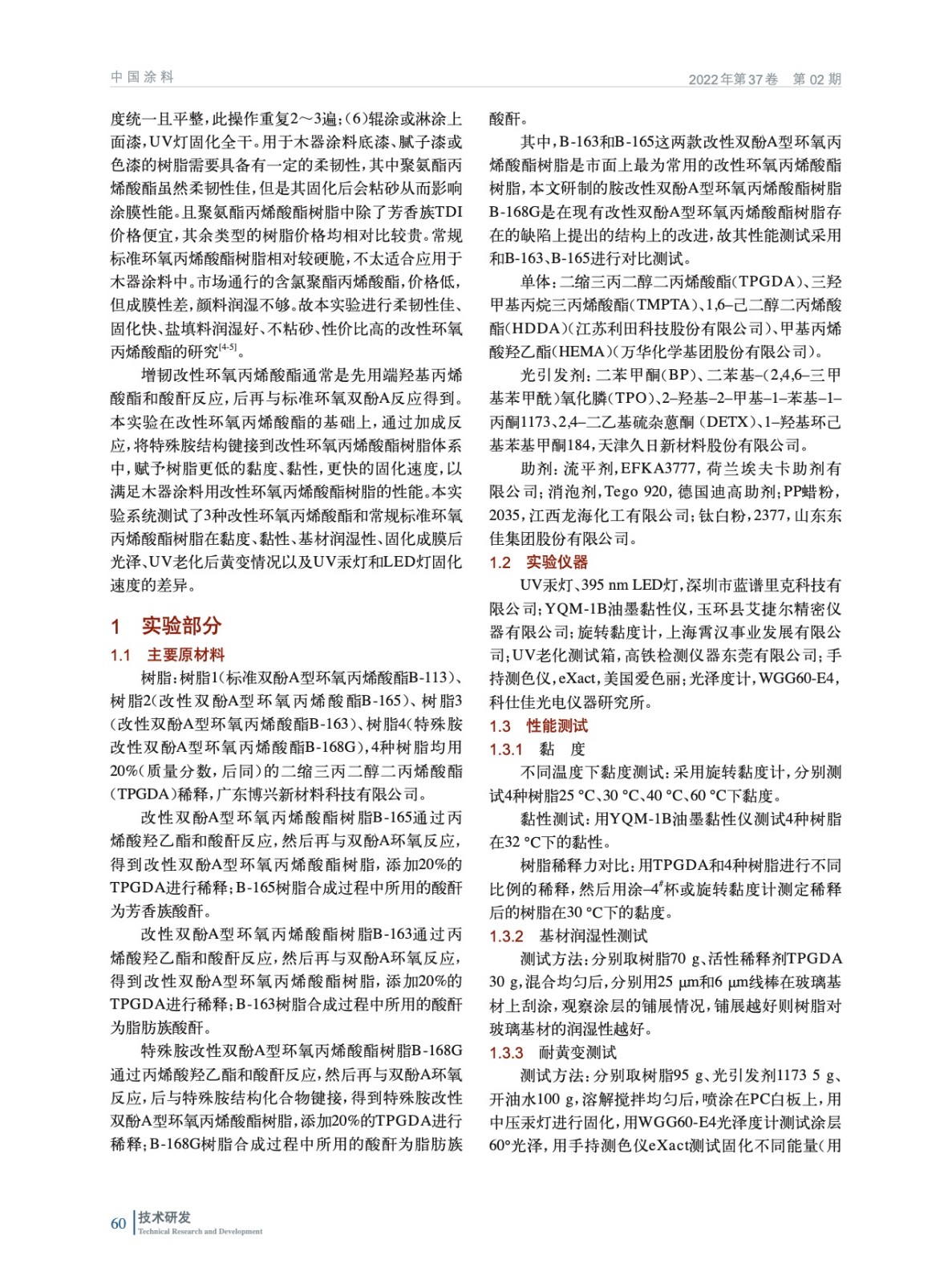 摘要:研究了3種改性雙酚A型環(huán)氧丙烯酸酯樹脂和標(biāo)準(zhǔn)雙酚A型環(huán)氧丙烯酸酯樹脂的性能對比,結(jié)果表明,特殊胺改性雙酚A型環(huán)氧丙烯酸酯樹脂B-168G比標(biāo)準(zhǔn)雙酚A型環(huán)氧丙烯酸酯樹脂B-113具有更低的黏度和黏性,稀釋性能更佳;UV汞燈或UVLED輻照固化下,改性樹脂的固化速度更快;改性樹脂的黃變均較小,且基材的潤濕性均較優(yōu)。在BP/DETX作為光引發(fā)劑下,B-168G具有良好的UV響應(yīng)活性。