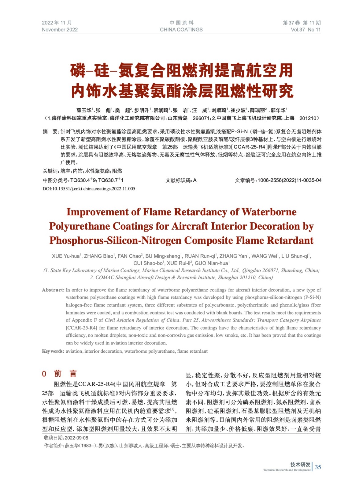 磷-硅-氮復(fù)合阻燃劑提高航空用內(nèi)飾水基聚氨酯涂層阻燃性