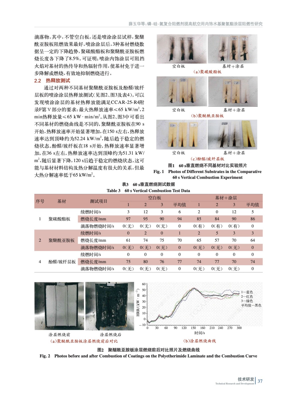 摘要:針對(duì)飛機(jī)內(nèi)飾對(duì)水性聚氨酯涂層高阻燃要求,采用磷改性水性聚氨酯乳液搭配P-Si-N(磷–硅–氮)系復(fù)合無(wú)鹵阻燃劑體系開發(fā)了新型高阻燃水性聚氨酯涂層,涂覆在聚碳酸酯板、聚醚酰亞胺及酚醛/玻纖層板3種基材上,與空白板進(jìn)行燃燒對(duì)比實(shí)驗(yàn),測(cè)試結(jié)果達(dá)到了《中國(guó)民用航空規(guī)章 第25部 運(yùn)輸類飛機(jī)適航標(biāo)準(zhǔn)》[CCAR-25-R4]附錄F部分關(guān)于內(nèi)飾阻燃的要求,涂層具有阻燃效率高、無(wú)熔融滴落物、無(wú)毒及無(wú)腐蝕性氣體釋放、低煙等特點(diǎn),經(jīng)驗(yàn)證可完全應(yīng)用在航空內(nèi)飾上推廣使用。