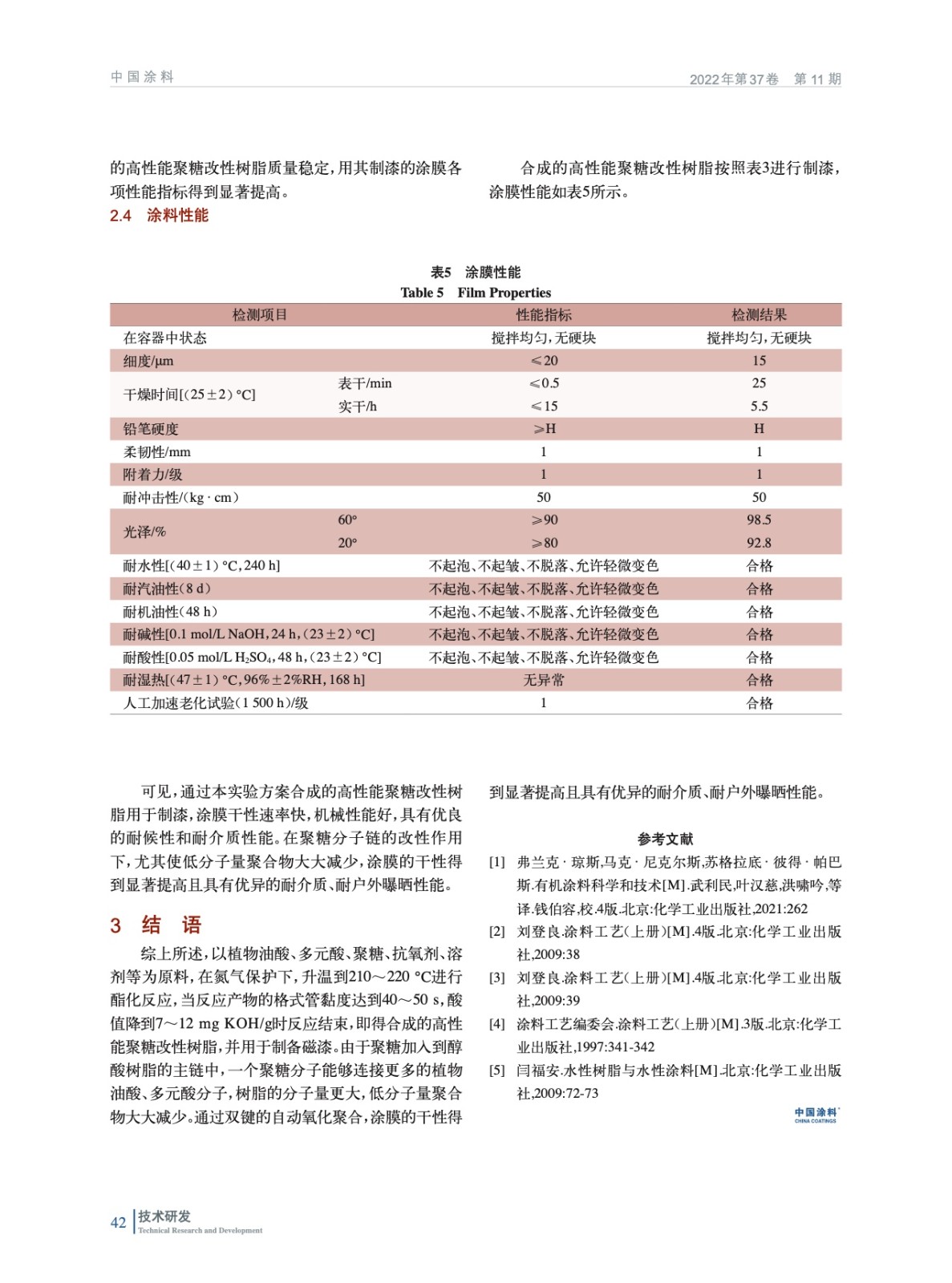 摘要:以植物油酸、多元酸、聚糖、抗氧劑、溶劑等為原料,在氮氣保護下,升溫到210~220 ℃進行酯化反應(yīng),合成高性能聚糖改性樹脂,并用于制備磁漆。討論了各種工藝條件對樹脂性能的影響以及后期的制漆性能。結(jié)果表明:通過配方的設(shè)計,在氣體保護作用下,聚糖加入到醇酸樹脂的主鏈中,一個聚糖分子能夠連接更多的植物油酸、多元酸分子,低分子量聚合物大大減少。通過雙鍵的自動氧化聚合,涂膜的干性得到顯著提高且具有優(yōu)異的耐介質(zhì)、戶外曝曬性能。