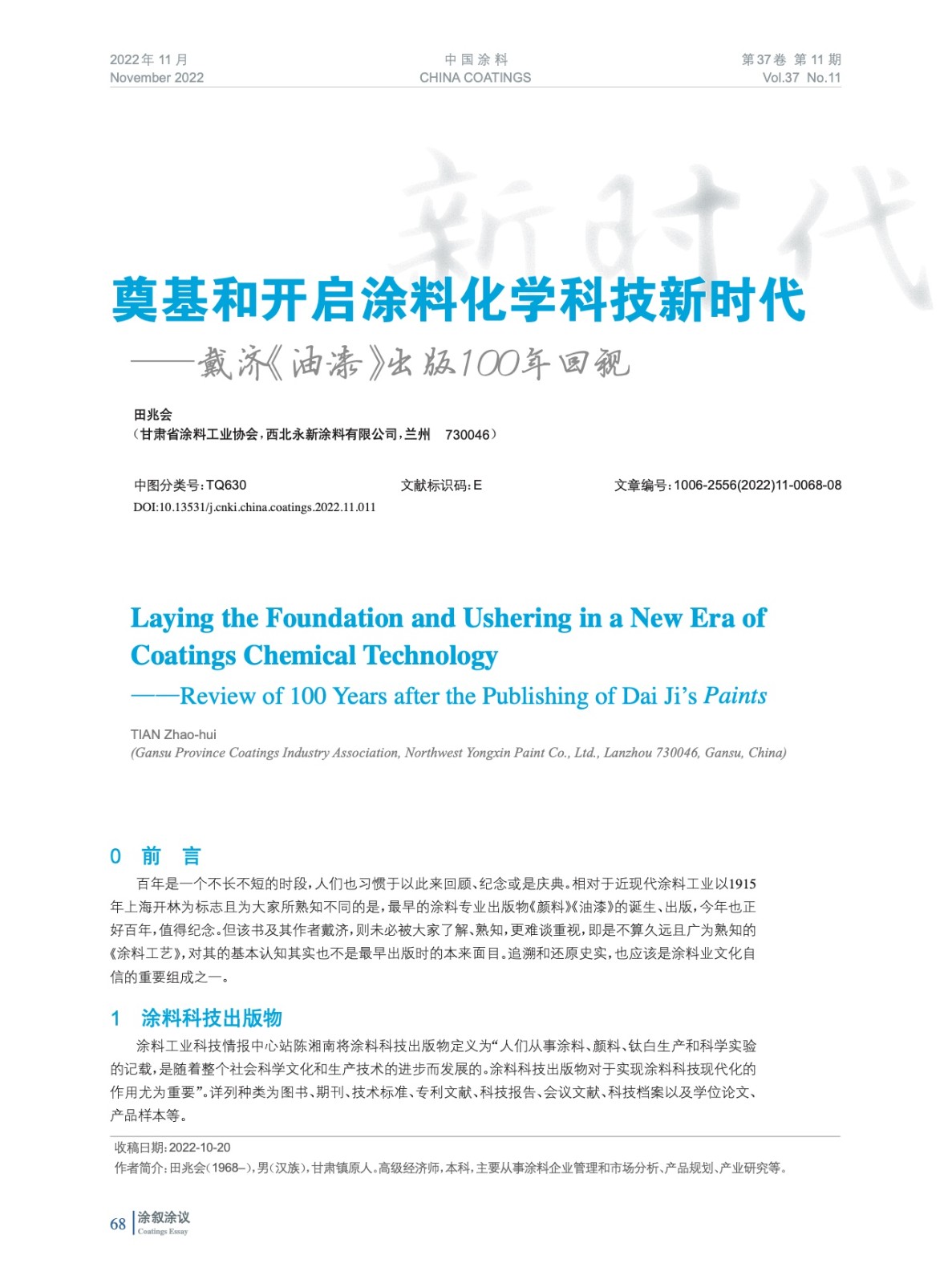 摘要:編者按:百年是一個不長不短的時段,人們也習(xí)慣于以此來回顧、紀(jì)念或是慶典。相對于近現(xiàn)代涂料工業(yè)以1915年上海開林為標(biāo)志且為大家所熟知不同的是,最早的涂料專業(yè)出版物《顏料》《油漆》的誕生、出版,今年也正好百年,值得紀(jì)念。該書及其作者戴濟,值得我們追溯和還原史實,也應(yīng)該是涂料業(yè)文化自信的重要組成之一。