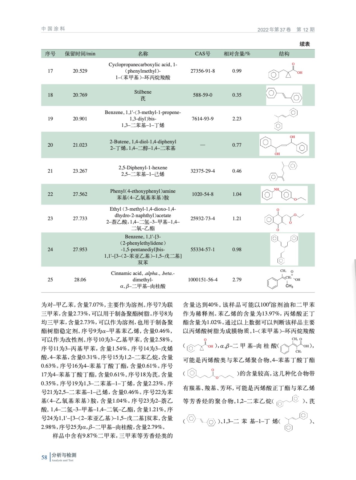 摘要:采用熱裂解–氣相色譜質譜(Py-GC/MS)方法對未知涂料樣品進行分析,樹脂在高溫惰性環境下裂解為低分子物質,再通過氣相色譜質譜分析。不需要繁復冗長的分離步驟,利用最后裂解碎片產物反推被測化合物的組成和結構,對低分子量的溶劑、高分子量的樹脂進行準確定性,對于常規方法難以定性的混合樹脂,熱裂解氣相–質譜聯用儀可以快速定性樹脂成分,對于涂料配方的改進、涂料性能的提升有重要意義。