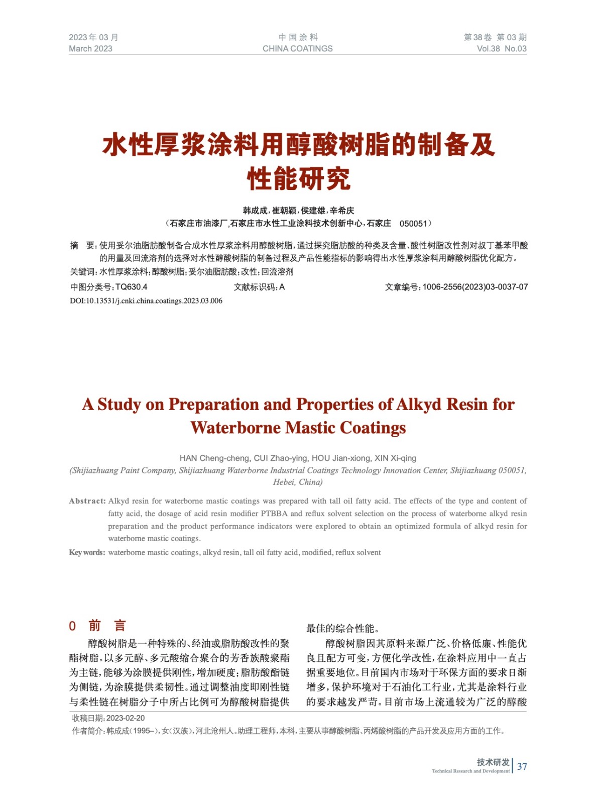 本文系作者@韓成成,崔朝穎,侯建雄,辛希慶 授權中國涂料網發表,并經中國涂料網編輯,未經允許不得轉載,如需轉載請聯系chinacoatingnet@vip.163.com