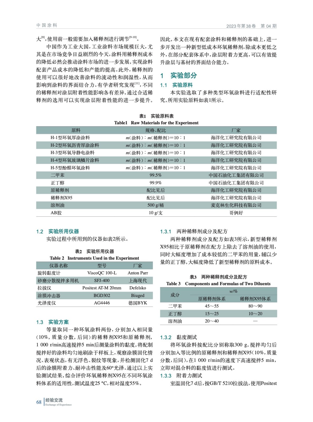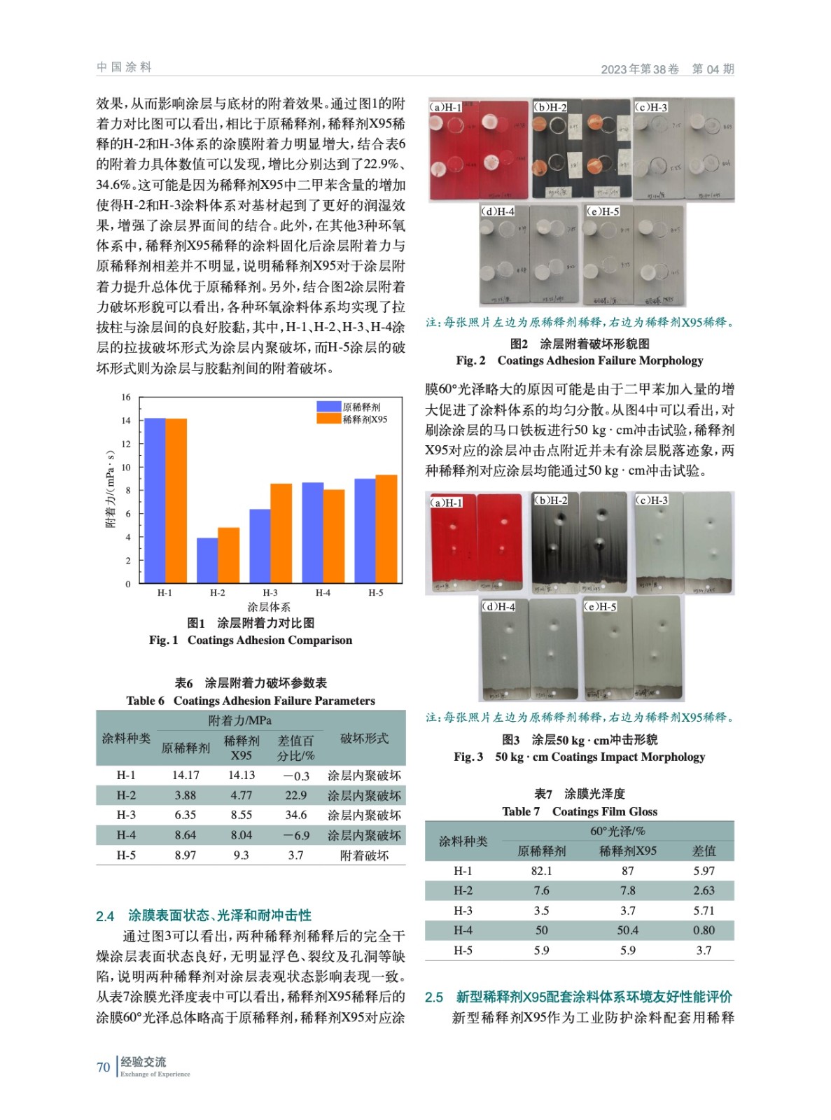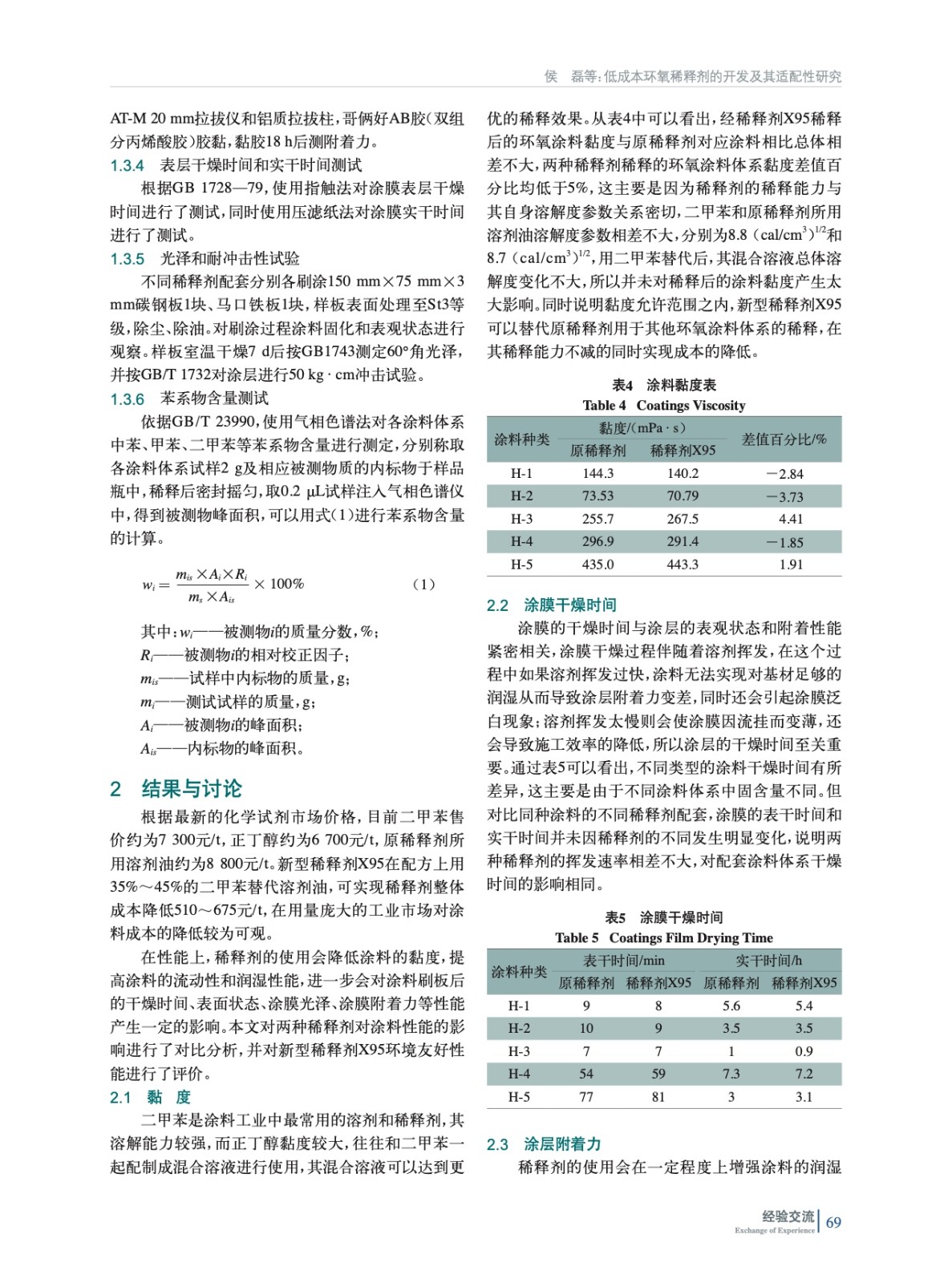 摘要:為降低涂料用稀釋劑成本,滿足工業(yè)涂料發(fā)展的需要,實驗開發(fā)出一種低成本的環(huán)氧稀釋劑(X95),并對其稀釋后涂料的黏度及涂層的表觀狀態(tài)、附著力、耐沖擊等性能進(jìn)行了研究。研究發(fā)現(xiàn),相比于原稀釋劑,稀釋劑X95對應(yīng)涂層附著力和60°光澤相對較高,涂層表面無明顯缺陷,50 kg·cm沖擊試驗后涂層無脫落,總體表現(xiàn)出比原稀釋劑更低的成本和更優(yōu)的適配性。