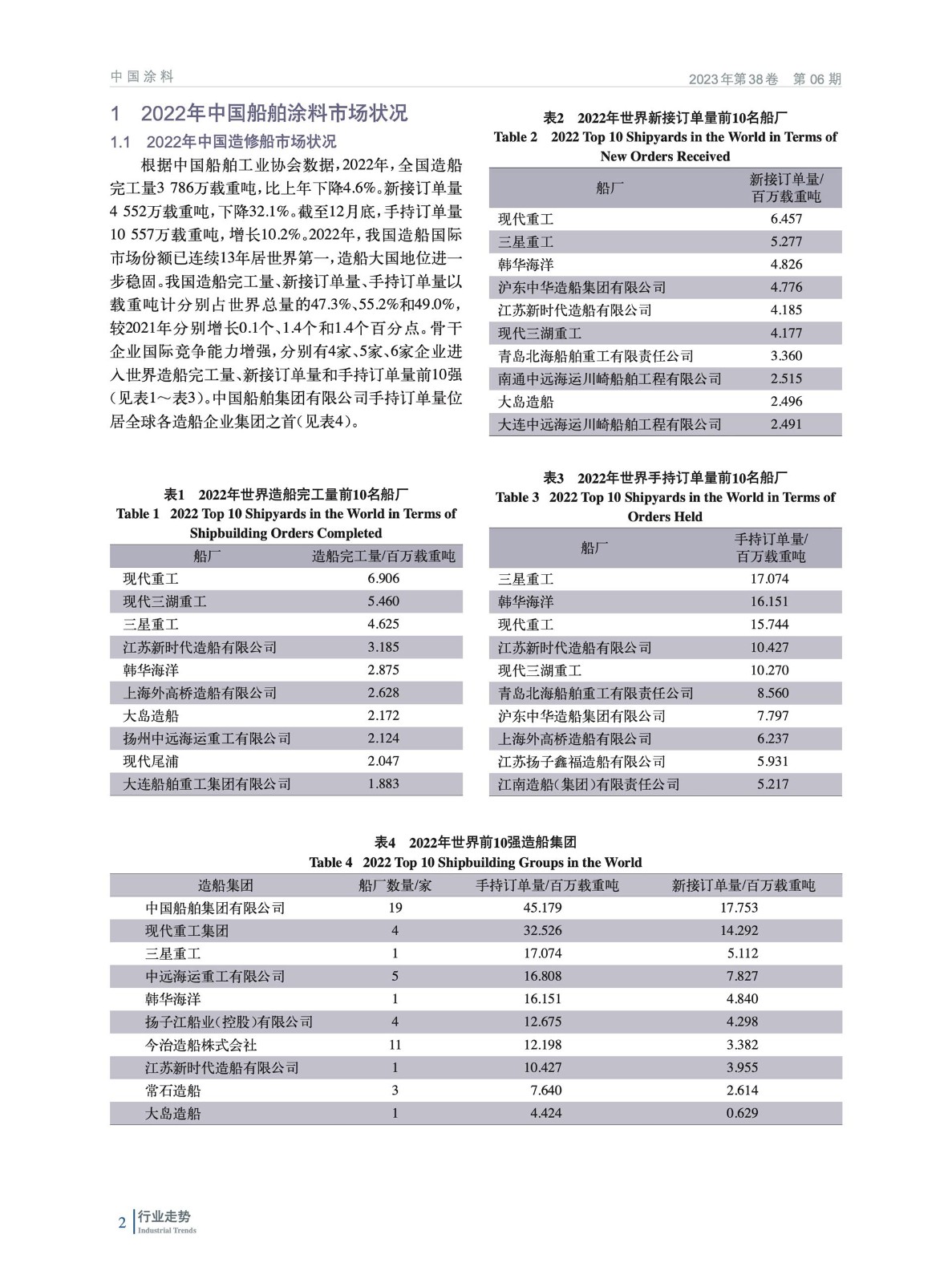 綜述了2022年中國造修船市場及船舶涂料市場情況,回顧梳理了2022年中國船舶涂料技術進展及相關政策和標準,并對2023年中國造船及船舶涂料市場進行了展望。