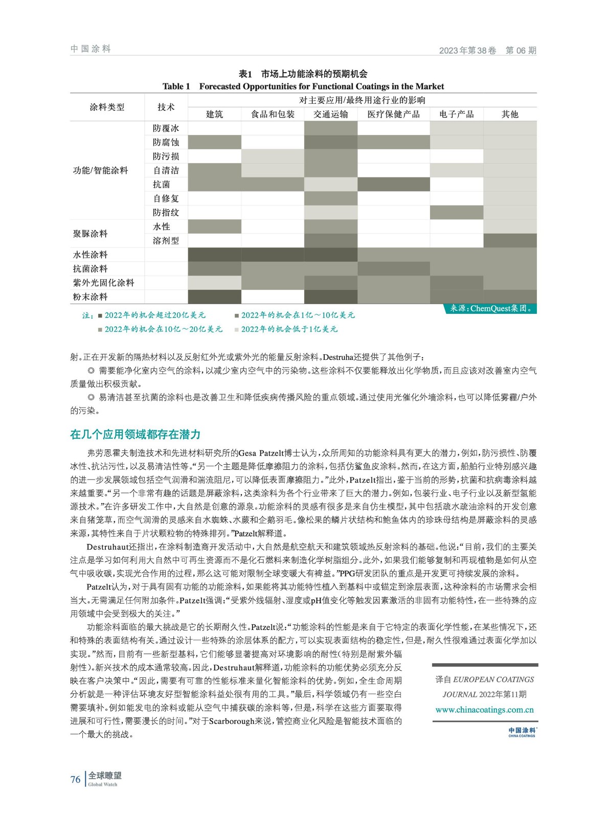 摘要:多年來,功能涂料一直是涂料發(fā)展中讓人振奮的領(lǐng)域。當(dāng)前對功能涂料或智能涂料的需求量很大,這有助于促進(jìn)向可持續(xù)發(fā)展的經(jīng)濟(jì)模式的過渡。ChemQuest集團(tuán)根據(jù)預(yù)測,將以下應(yīng)用領(lǐng)域作為領(lǐng)先增值領(lǐng)域:用于辦公家具的高檔涂料、用于IT行業(yè)的涂料、用于照明設(shè)備的某些涂料領(lǐng)域以及高反射材料。