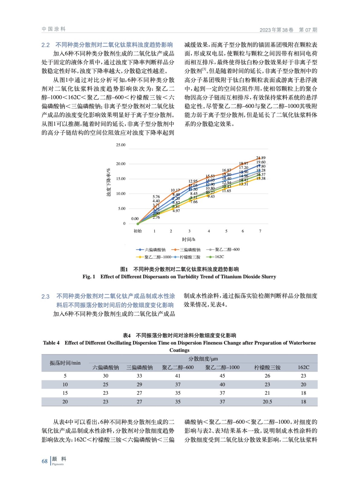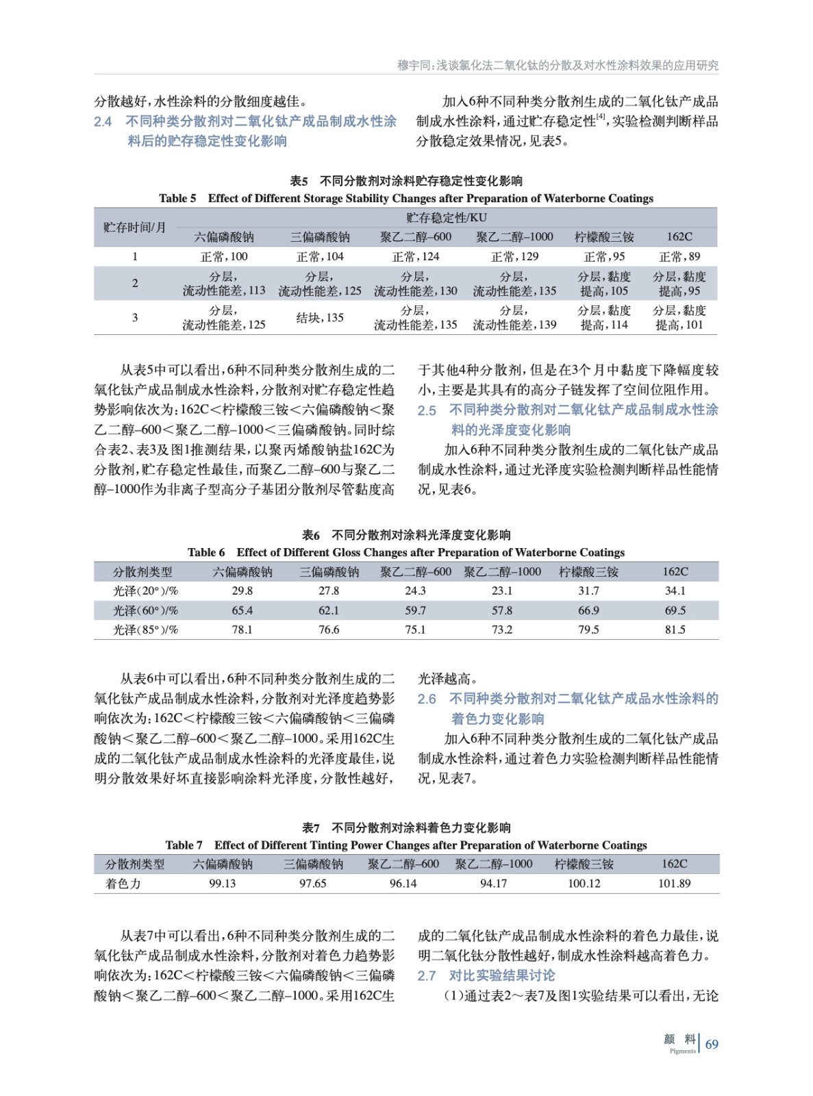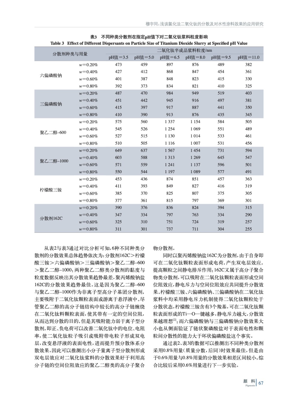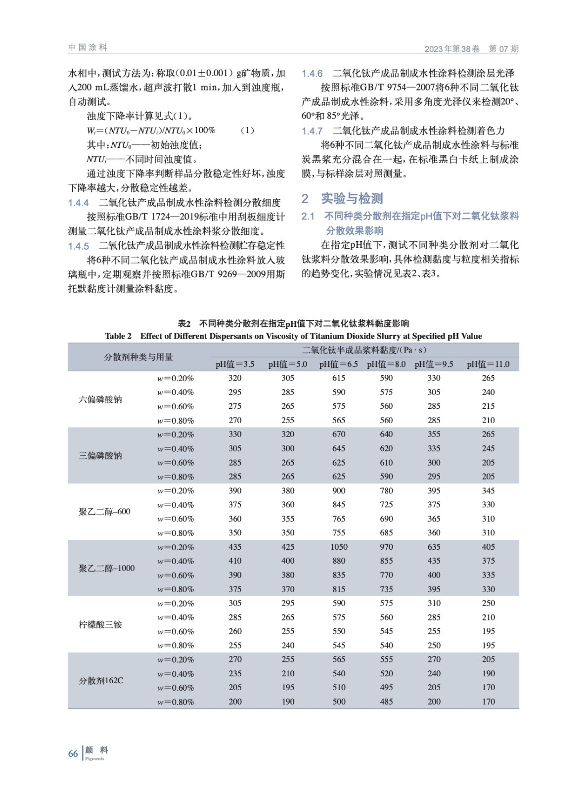 通過采用大量對體系黏度、粒度、分散細度、光澤度等檢測手段,研究氯化法二氧化鈦漿料與不同種類分散劑組成的漿料體系在包覆膜層前后對漿料預分散體系、制成水性涂料后的分散變化趨勢與效果,確定較佳的分散劑種類和方案,以便提高二氧化鈦產成品在水性涂料中的分散應用性能。