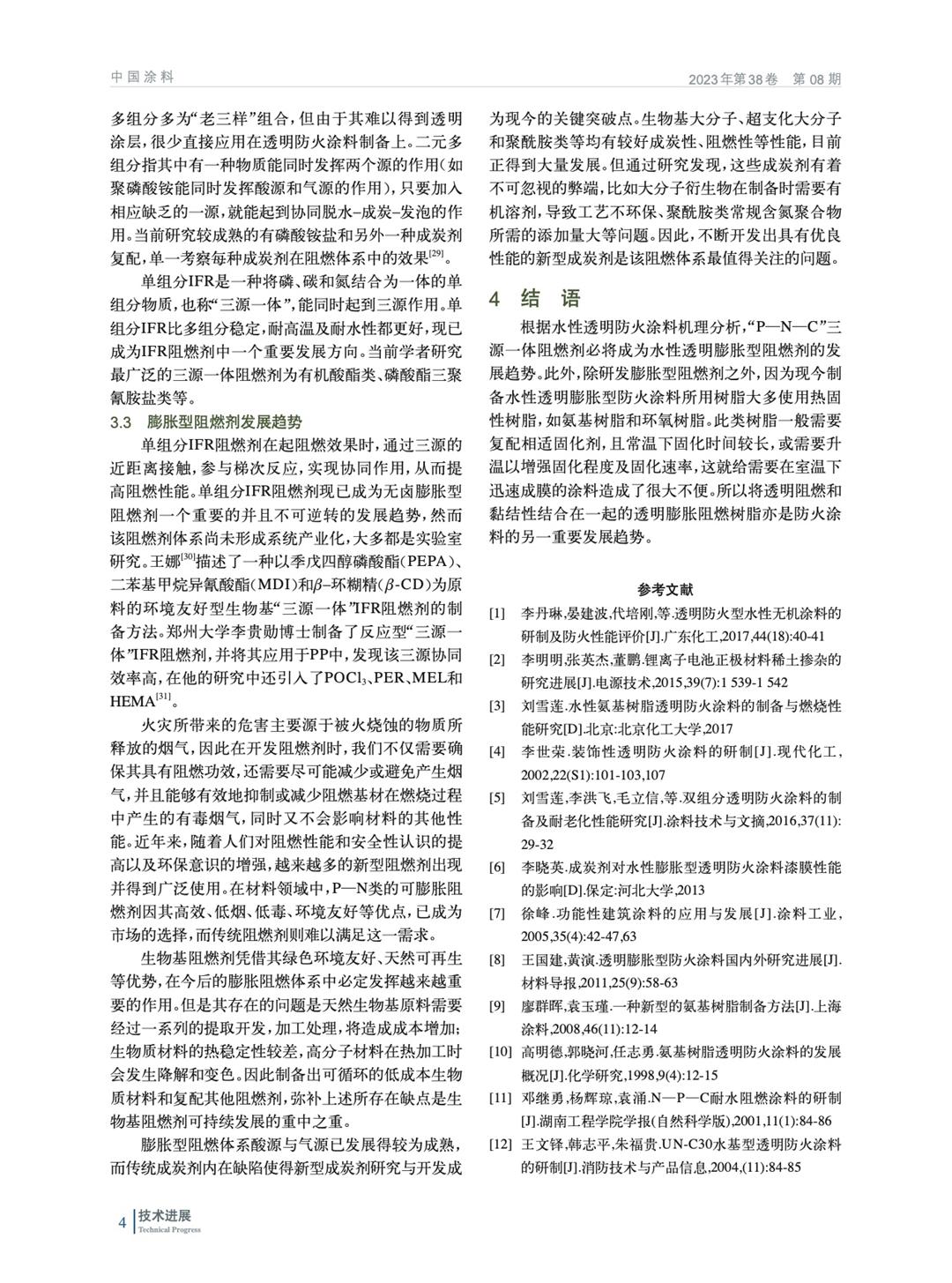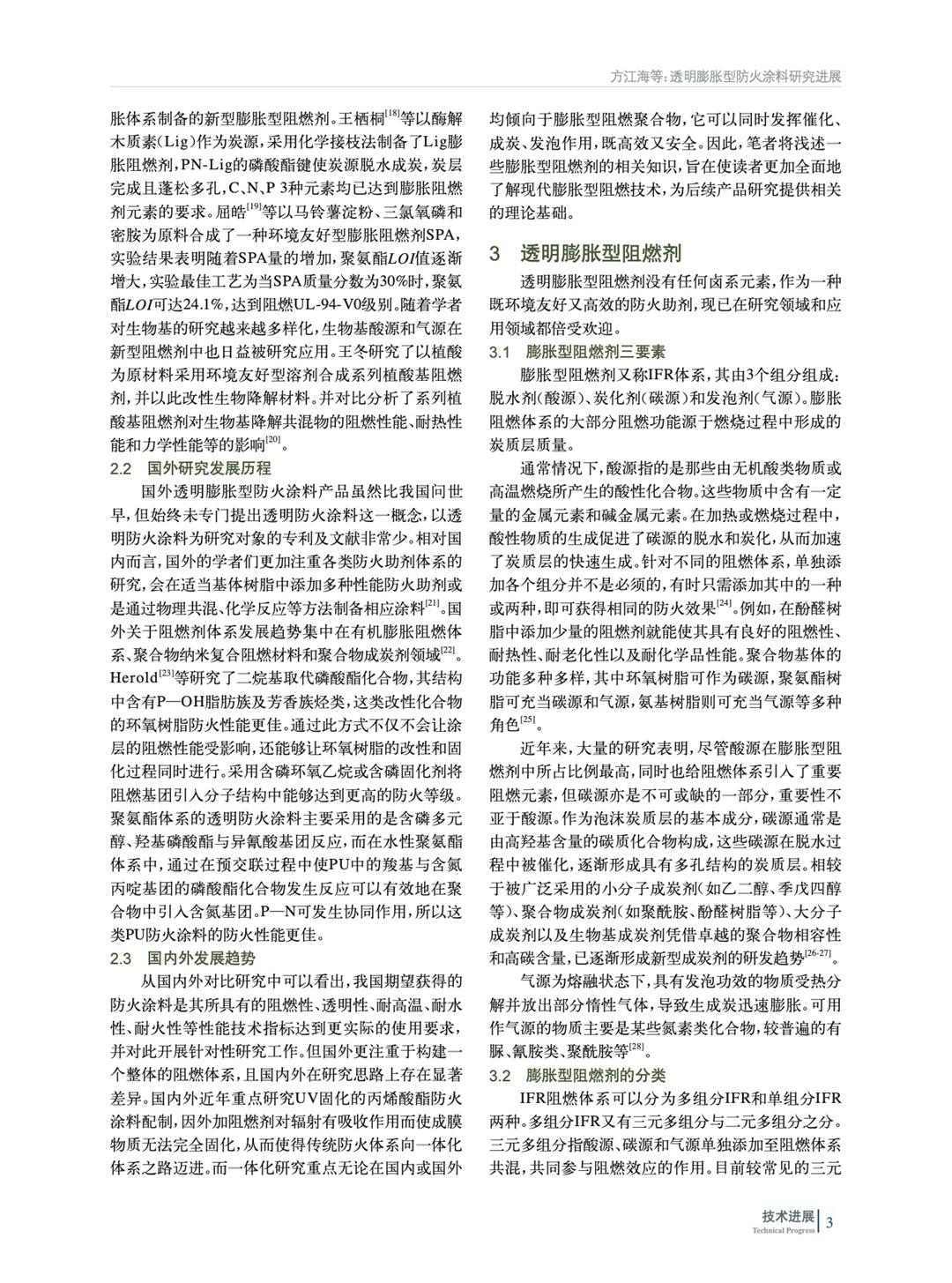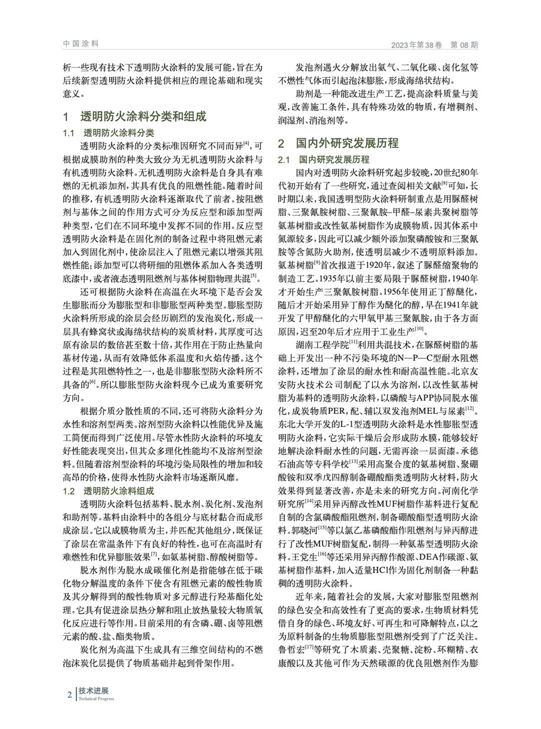 簡要介紹了透明防火涂料的分類和組成,然后闡述國內外透明防火涂料的發展現狀并進行對比歸納,進一步介紹膨脹型阻燃劑的發展概況及未來展望。