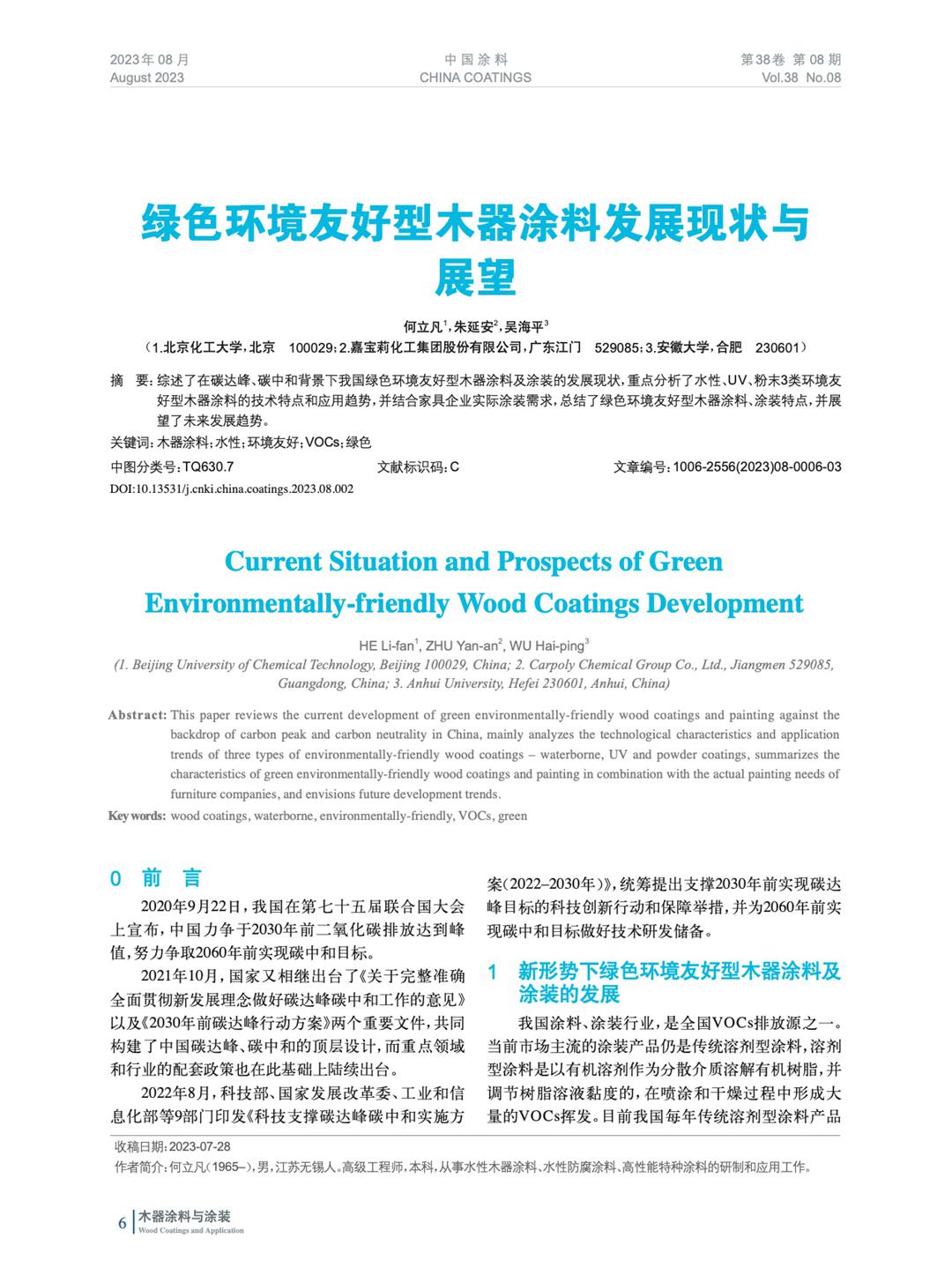 摘要:綜述了在碳達(dá)峰、碳中和背景下我國(guó)綠色環(huán)境友好型木器涂料及涂裝的發(fā)展現(xiàn)狀,重點(diǎn)分析了水性、UV、粉末3類環(huán)境友好型木器涂料的技術(shù)特點(diǎn)和應(yīng)用趨勢(shì),并結(jié)合家具企業(yè)實(shí)際涂裝需求,總結(jié)了綠色環(huán)境友好型木器涂料、涂裝特點(diǎn),并展望了未來(lái)發(fā)展趨勢(shì)。