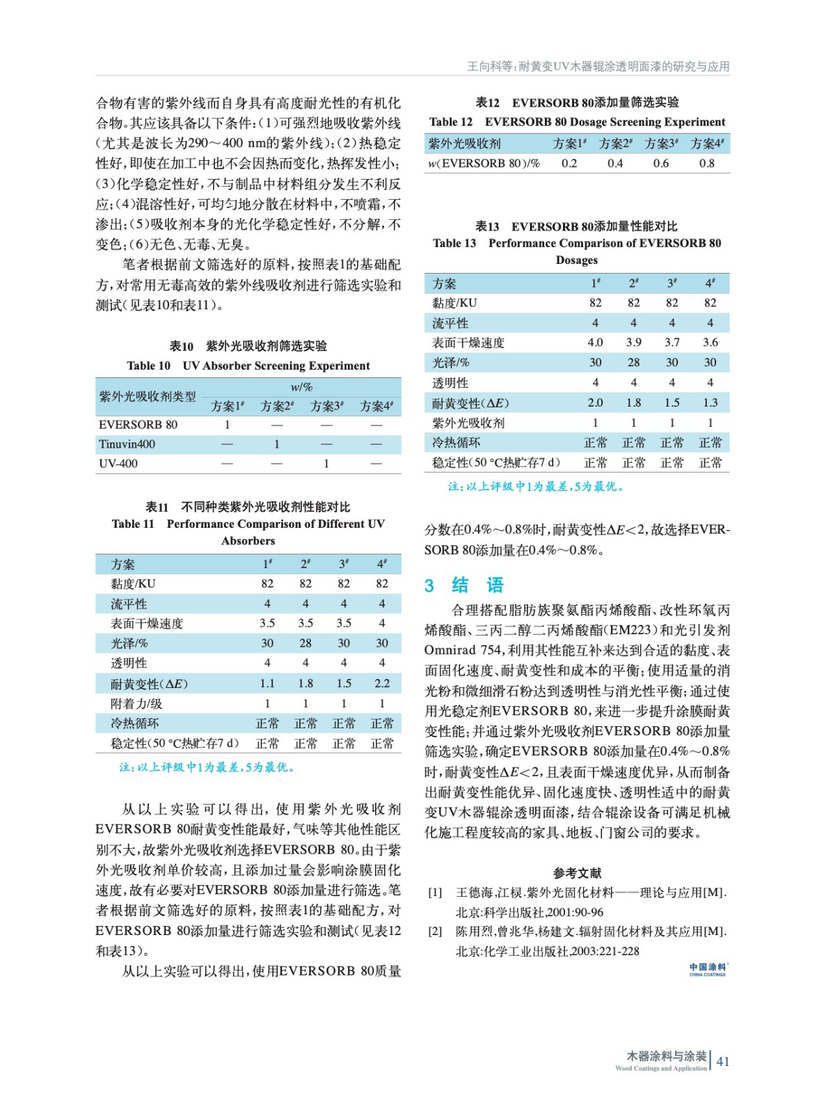 針對耐黃變UV木器輥涂透明面漆,從UV樹脂、單體、光引發(fā)劑和紫外線吸收劑選擇等方面進行探討,通過實驗論證以及輥涂設備應用測試,驗證了其在工業(yè)化大批量應用的可行性。
