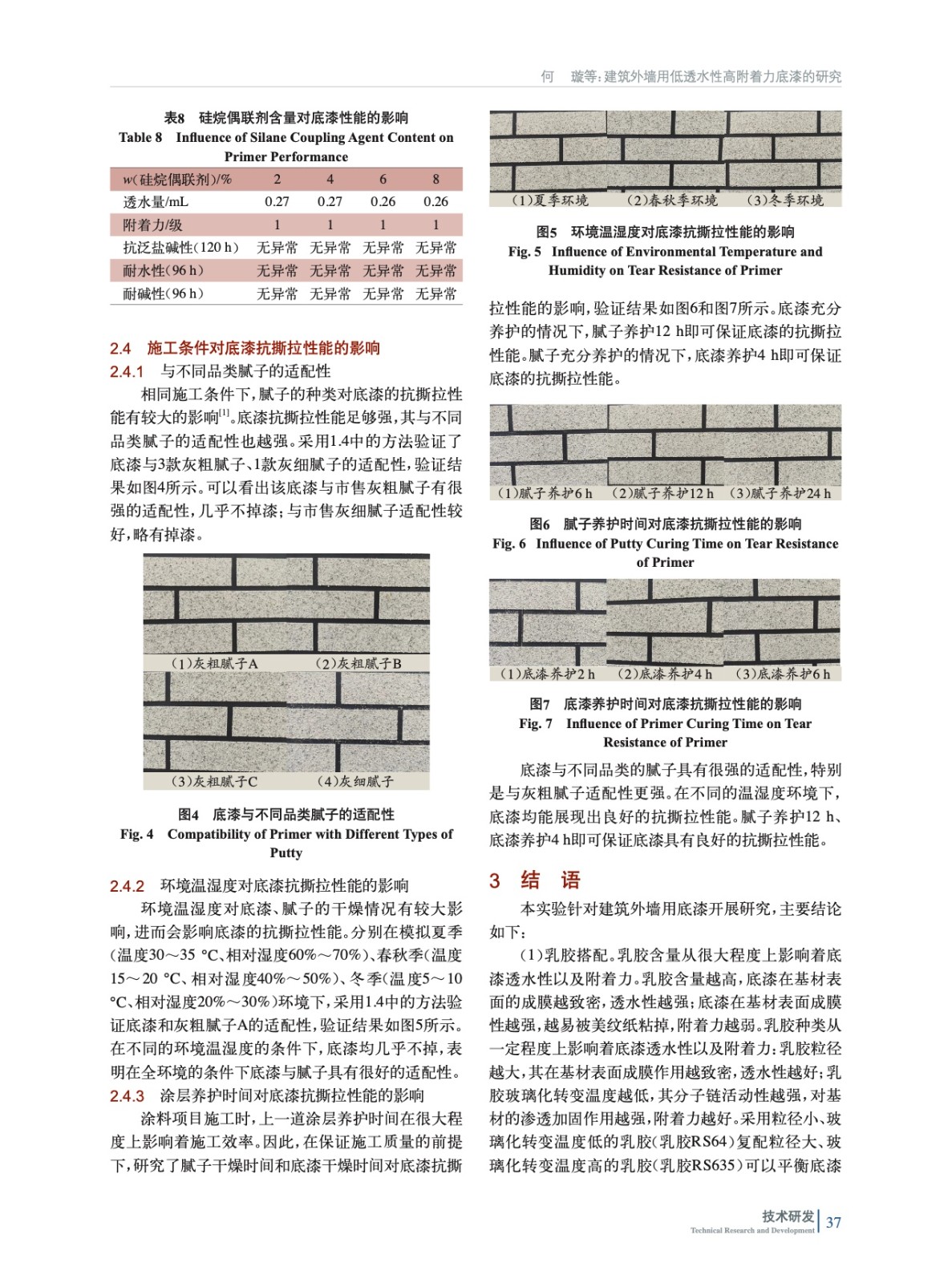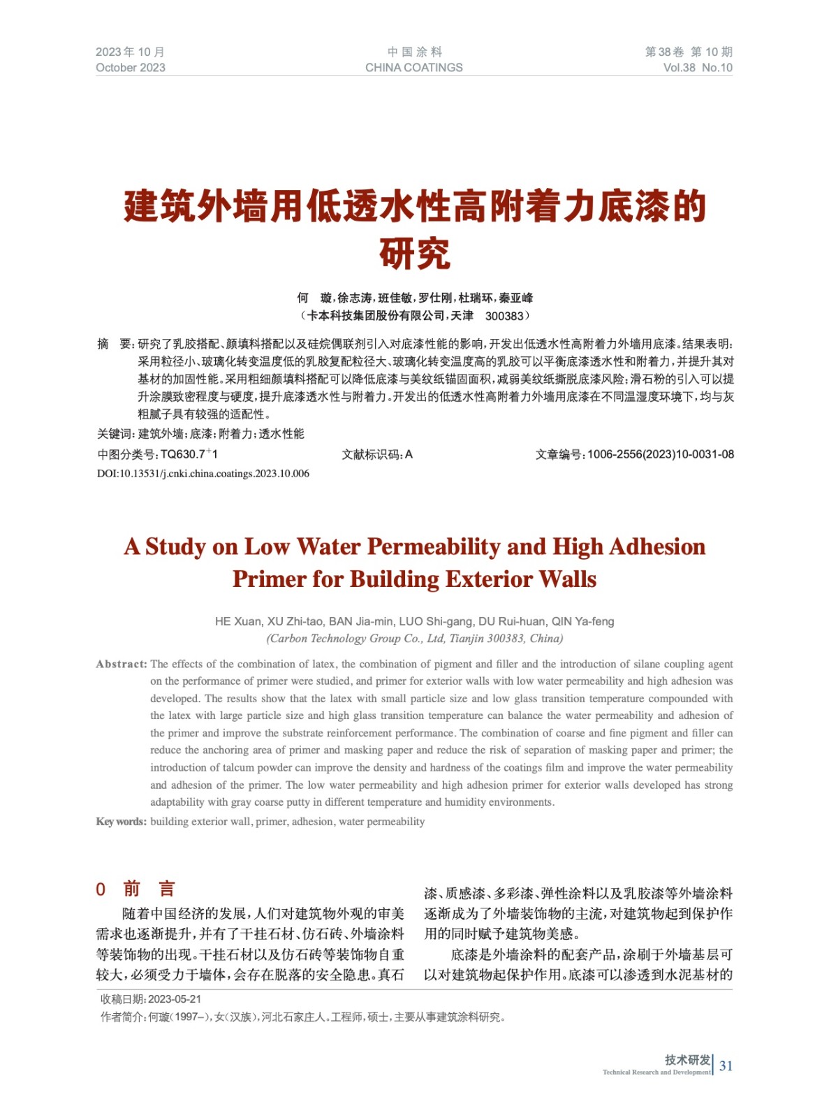 摘要:研究了乳膠搭配、顏填料搭配以及硅烷偶聯(lián)劑引入對底漆性能的影響,開發(fā)出低透水性高附著力外墻用底漆。結(jié)果表明:采用粒徑小、玻璃化轉(zhuǎn)變溫度低的乳膠復(fù)配粒徑大、玻璃化轉(zhuǎn)變溫度高的乳膠可以平衡底漆透水性和附著力,并提升其對基材的加固性能。采用粗細顏填料搭配可以降低底漆與美紋紙錨固面積,減弱美紋紙撕脫底漆風險;滑石粉的引入可以提升涂膜致密程度與硬度,提升底漆透水性與附著力。開發(fā)出的低透水性高附著力外墻用底漆在不同溫濕度環(huán)境下,均與灰粗膩子具有較強的適配性。