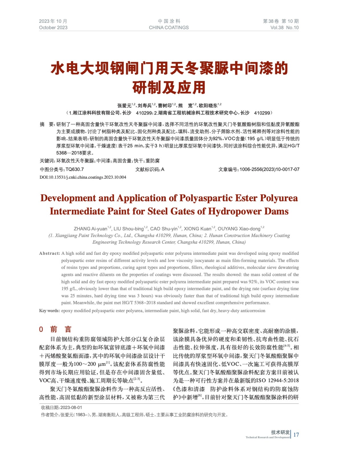 水電大壩鋼閘門用天冬聚脲中間漆的研制及應(yīng)用