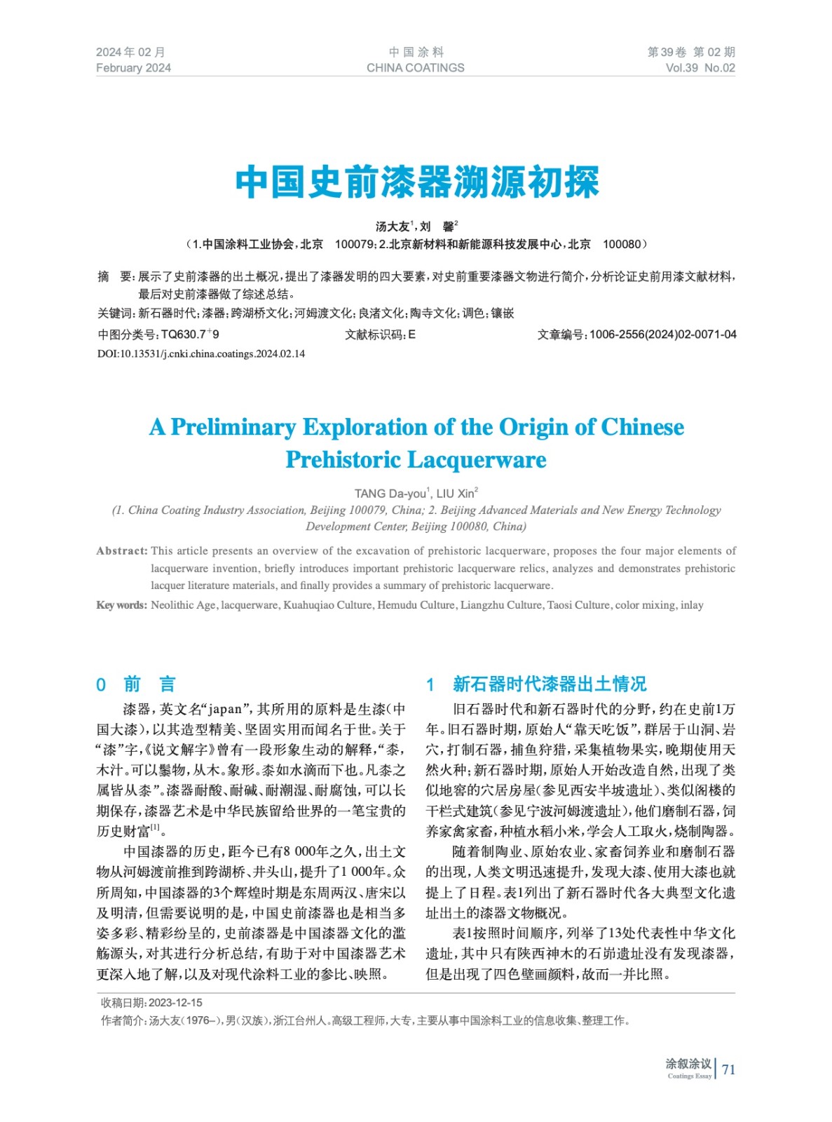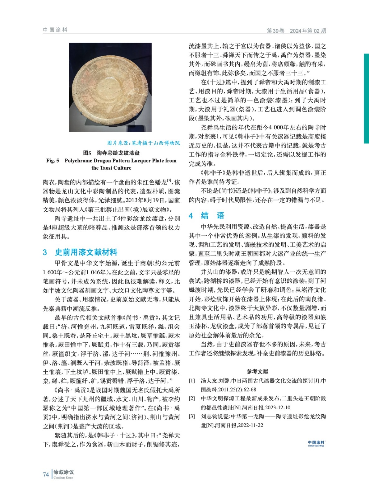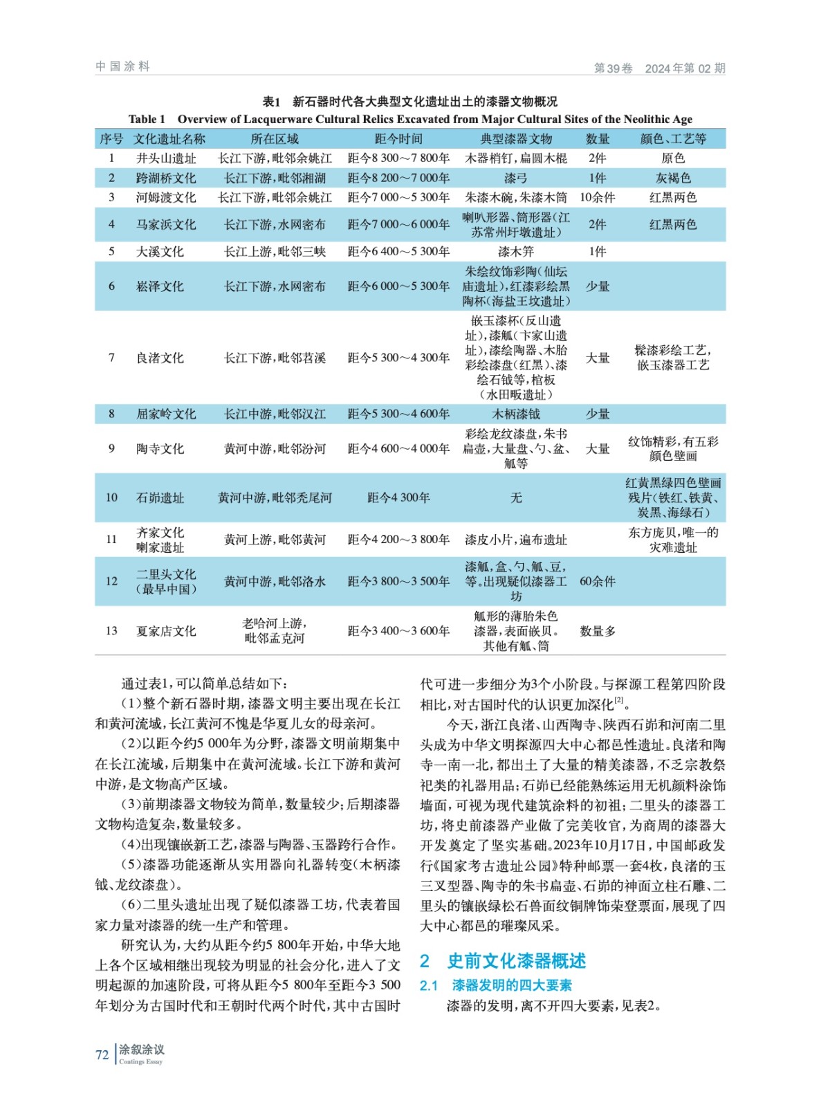 展示了史前漆器的出土概況,提出了漆器發明的四大要素,對史前重要漆器文物進行簡介,分析論證史前用漆文獻材料,最后對史前漆器做了綜述總結。