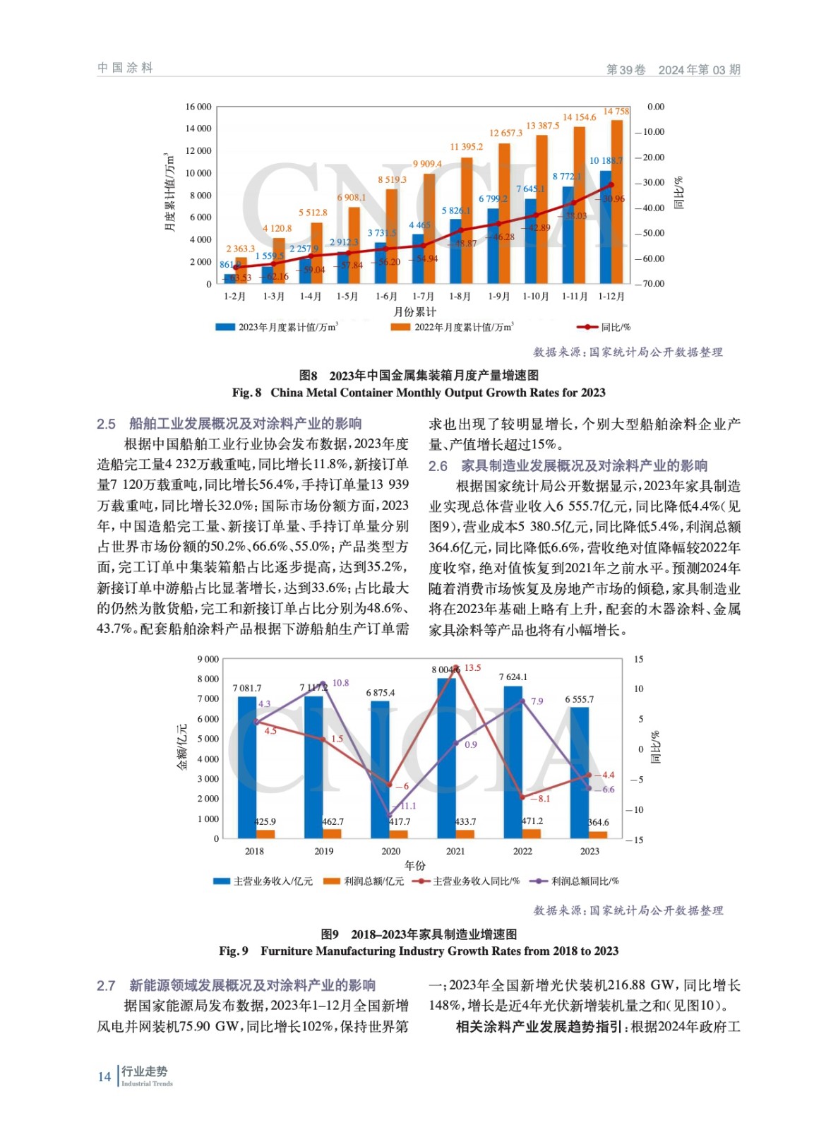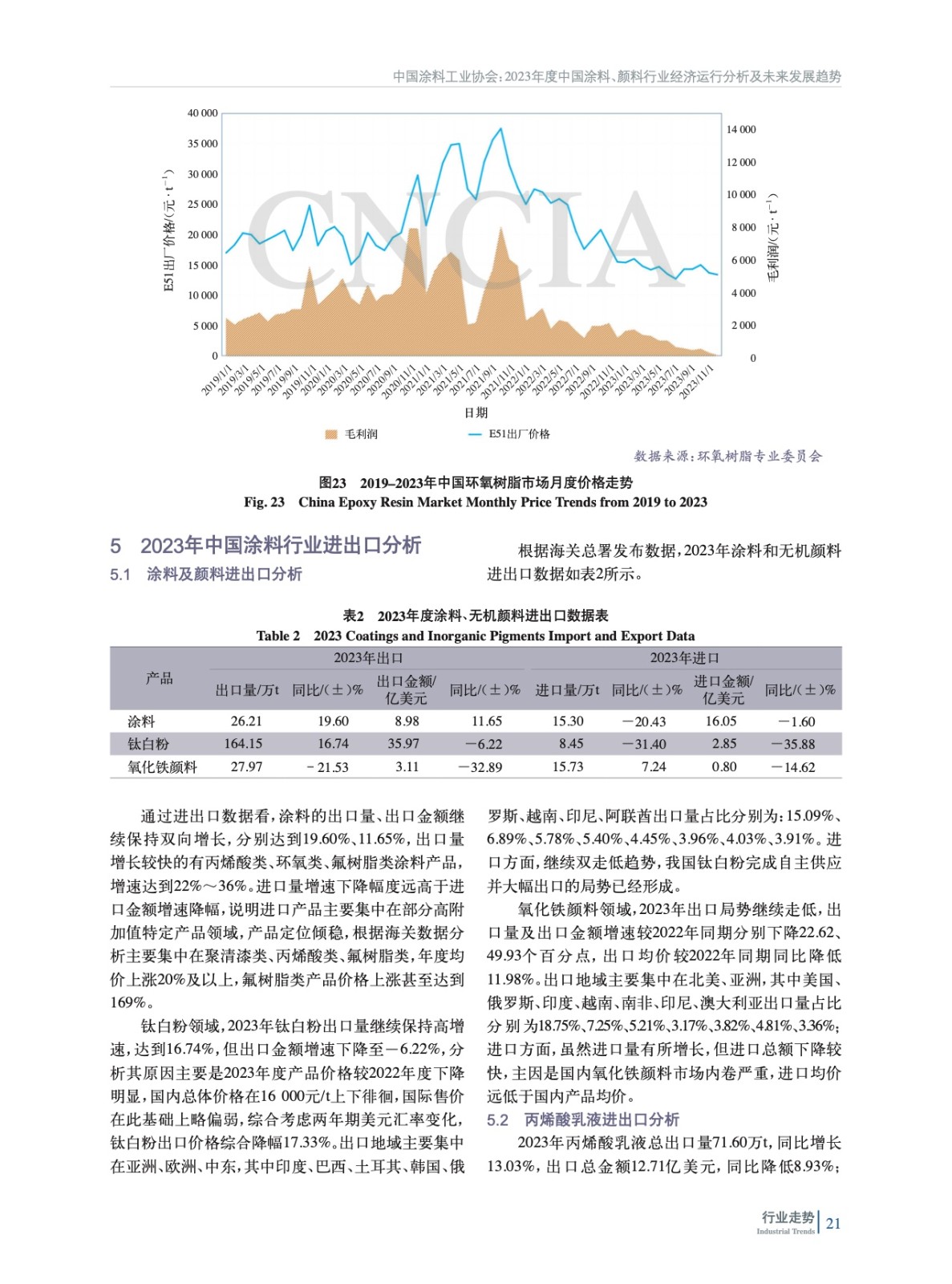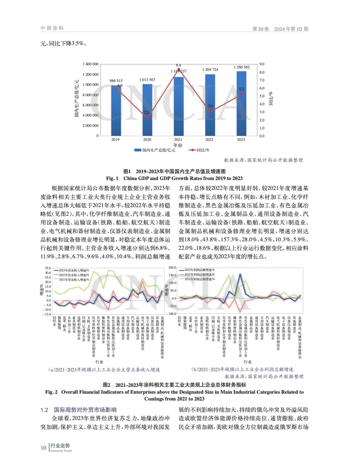 摘要:簡析了2023年中國宏觀經濟及外部環境發展情況,概括介紹了2023年涂料重點下游、新興領域發展概況及對涂料行業的影響,重點分析了2023年度中國涂料行業發展和進出口情況,并對上游鈦白粉、氧化鐵、丙烯酸乳液和環氧樹脂領域發展情況進行了概述。最后對中國涂料行業特征和發展趨勢進行了分析和預測。