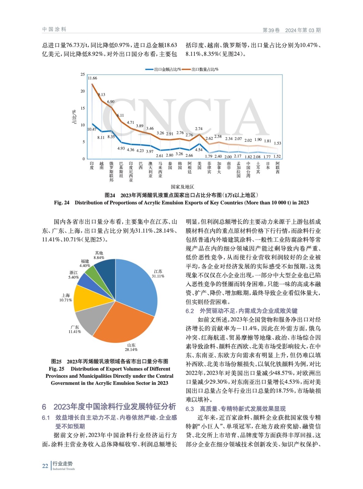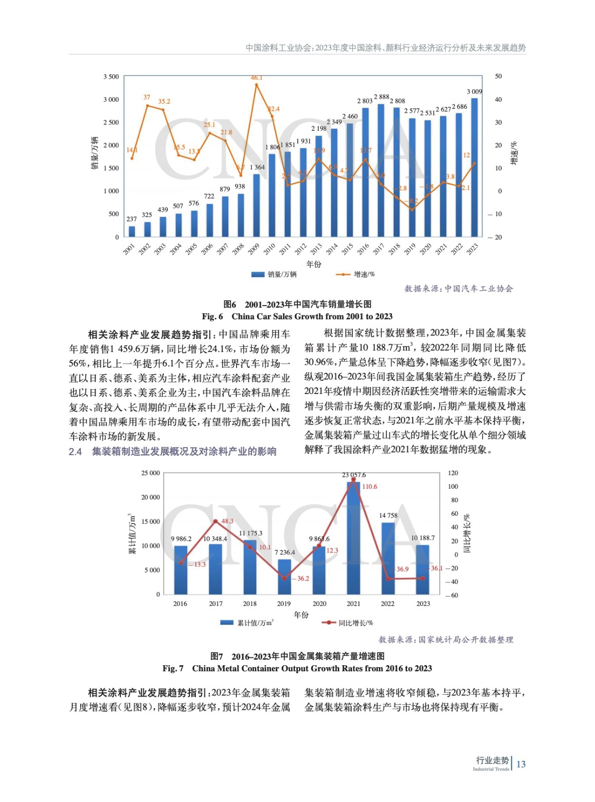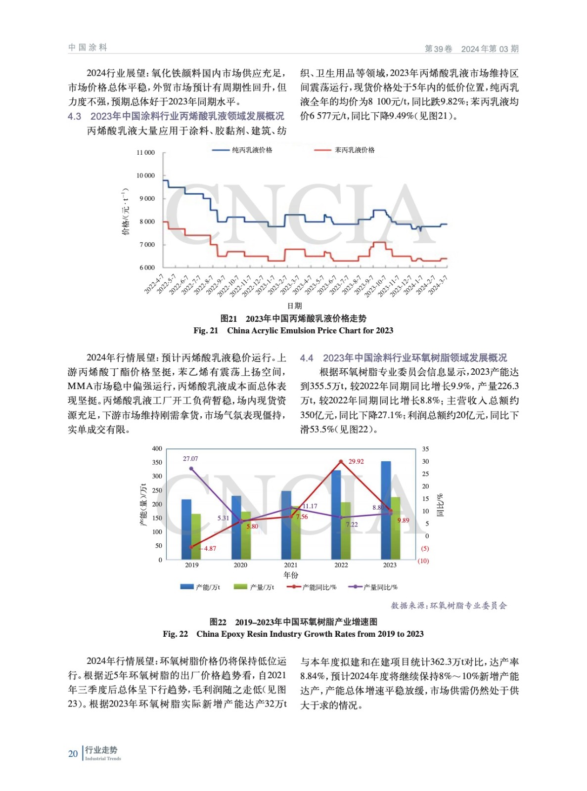 摘要:簡析了2023年中國宏觀經濟及外部環境發展情況,概括介紹了2023年涂料重點下游、新興領域發展概況及對涂料行業的影響,重點分析了2023年度中國涂料行業發展和進出口情況,并對上游鈦白粉、氧化鐵、丙烯酸乳液和環氧樹脂領域發展情況進行了概述。最后對中國涂料行業特征和發展趨勢進行了分析和預測。