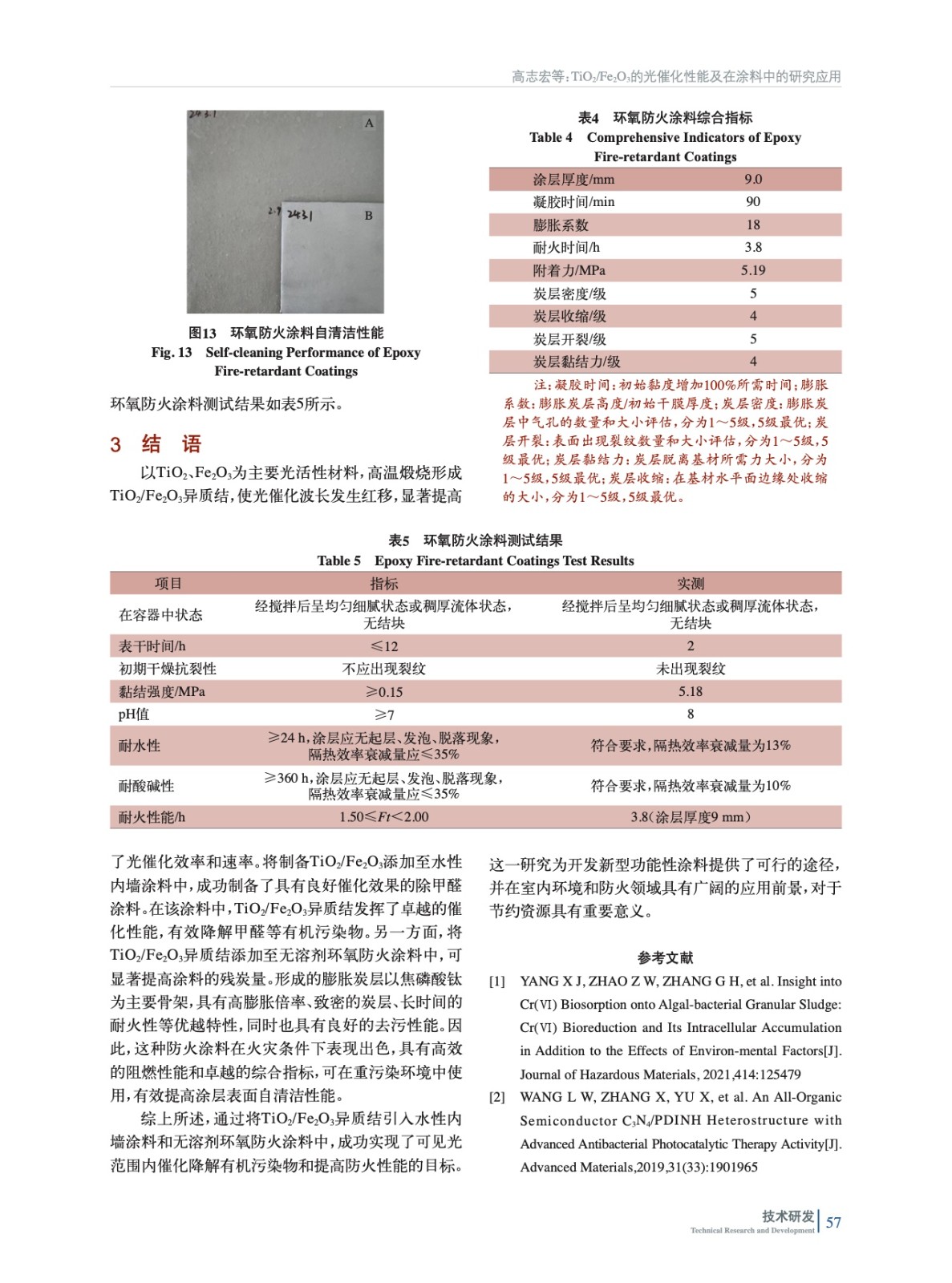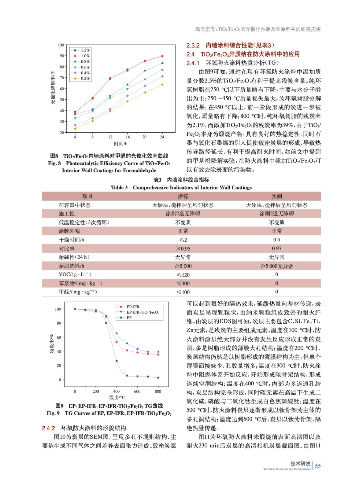 摘要:采用水熱法合成TiO2、Fe2O3的前聚體,并通過高溫煅燒制備了TiO2/Fe2O3異質(zhì)結(jié),通過XRD、SEM、TEM等一系列表征TiO2、Fe2O3的形成,紫外–漫反射光譜圖表明,TiO2/Fe2O3異質(zhì)結(jié)在可見光范圍內(nèi)吸光性能較TiO2和Fe2O3明顯紅移。通過Tauc曲線、Mott-Schottky曲線理論計(jì)算得出TiO2/Fe2O3異質(zhì)結(jié)的形成,該異質(zhì)結(jié)對(duì)甲基橙的180 min催化率為94%,可見光范圍內(nèi)表現(xiàn)出卓越的光催化活性。在內(nèi)墻涂料中添加質(zhì)量比為1∶100時(shí)對(duì)甲醛24 h 光催化降解效率為89.6%,TiO2/Fe2O3異質(zhì)結(jié)在高溫煅燒下形成一種優(yōu)良的耐高溫填料,因此在防火涂料中的應(yīng)用顯著增強(qiáng)了其阻燃抑煙性能。在防火涂料中的添加質(zhì)量比為2.5∶100時(shí),防火涂料的殘?zhí)苛繌?5%提升至39%,環(huán)氧防火涂料9.0 mm耐火230 min,呈現(xiàn)出良好的防火性能,環(huán)氧涂層黏結(jié)力強(qiáng),耐久性、機(jī)械性好,膨脹炭層強(qiáng)度高、致密性好,TiO2/Fe2O3異質(zhì)結(jié)存在還使該防火涂料具有良好的自清潔性能。