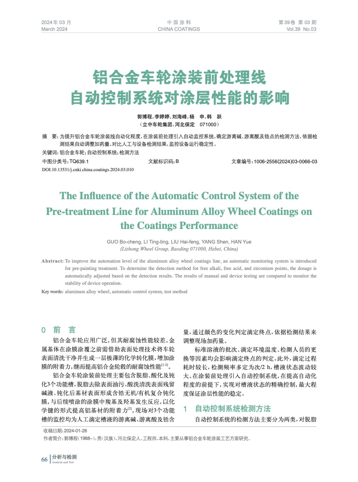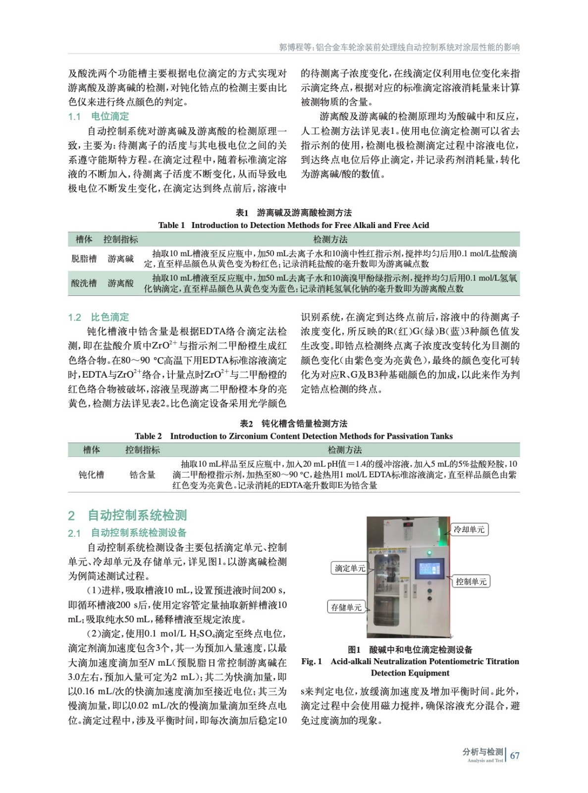 為提升鋁合金車輪涂裝線自動化程度,在涂裝前處理引入自動監控系統。確定游離堿、游離酸及鋯點的檢測方法,依據檢測結果自動調整加藥量。對比人工與設備檢測結果,監控設備運行穩定性。