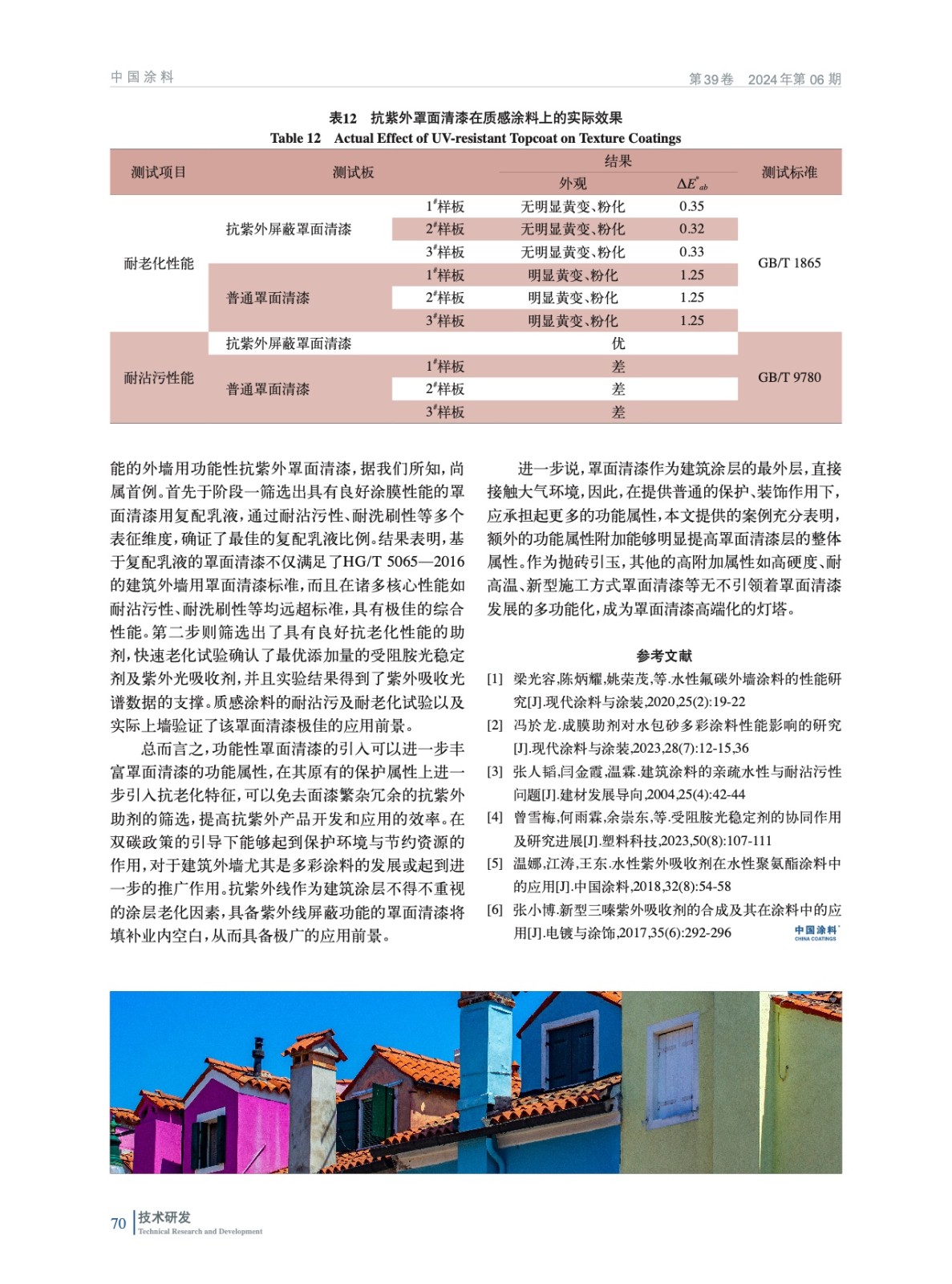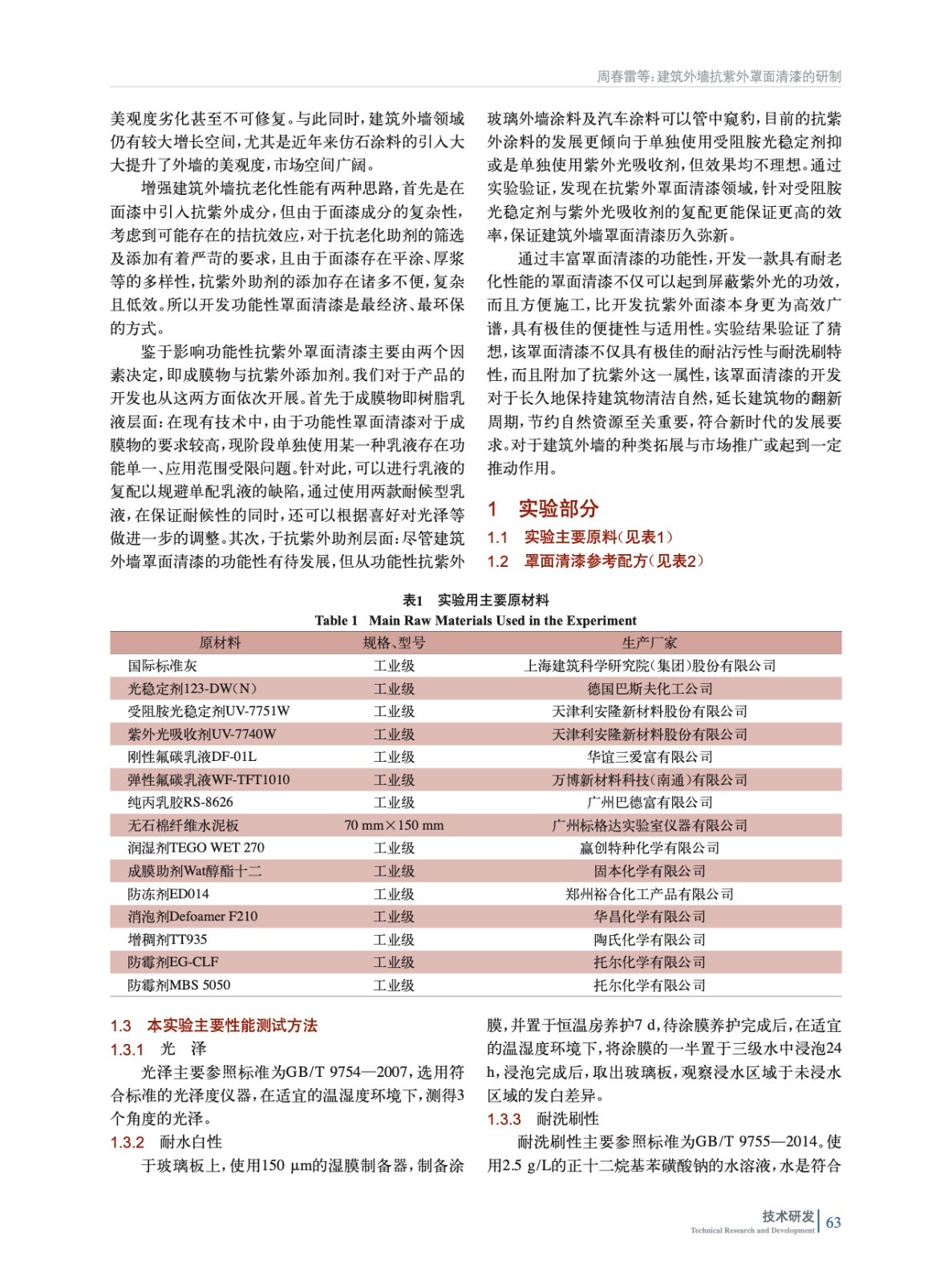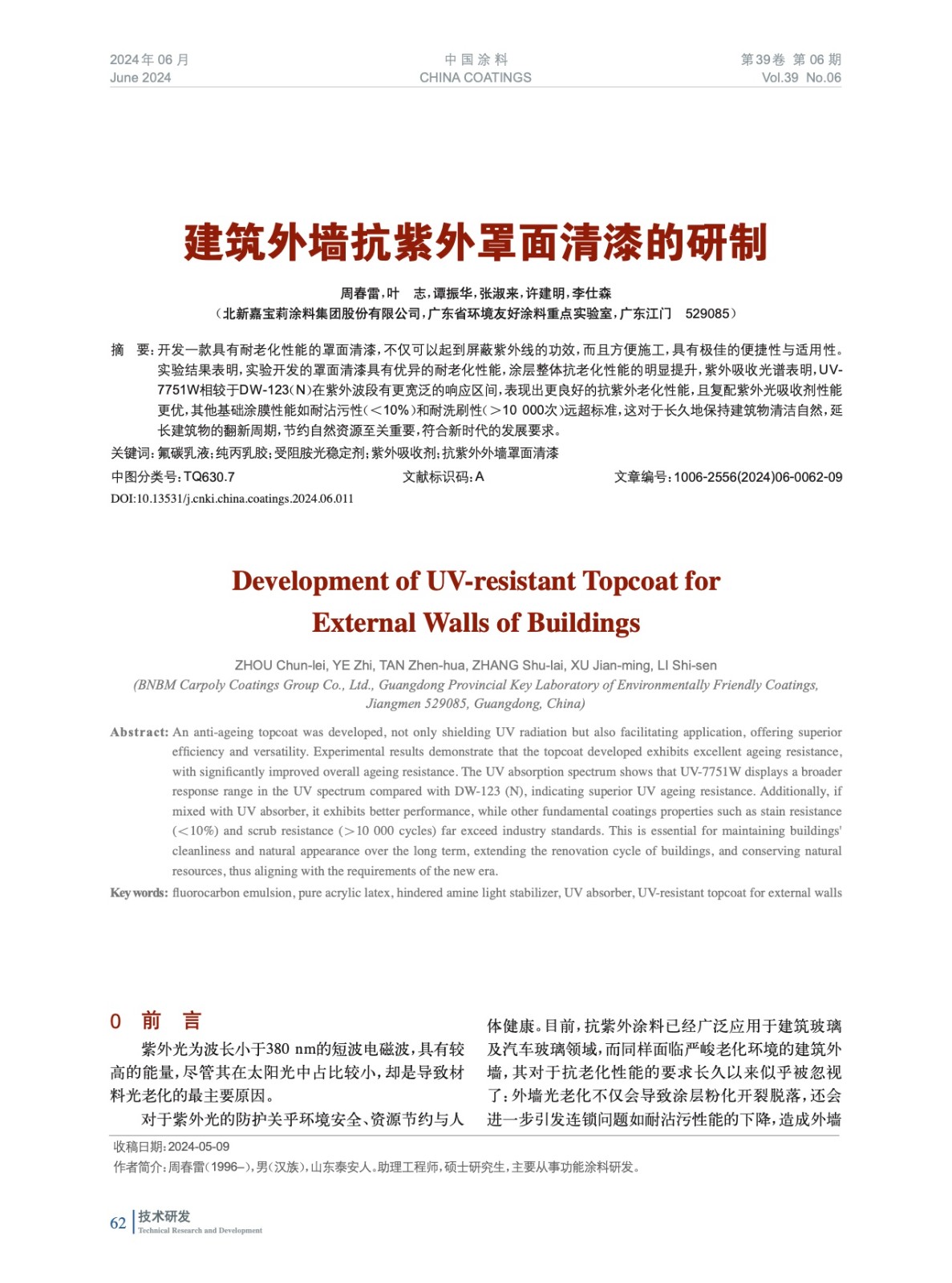 摘要:開發(fā)一款具有耐老化性能的罩面清漆,不僅可以起到屏蔽紫外線的功效,而且方便施工,具有極佳的便捷性與適用性。實驗結(jié)果表明,實驗開發(fā)的罩面清漆具有優(yōu)異的耐老化性能,涂層整體抗老化性能的明顯提升,紫外吸收光譜表明,UV-7751W相較于DW-123(N)在紫外波段有更寬泛的響應區(qū)間,表現(xiàn)出更良好的抗紫外老化性能,且復配紫外光吸收劑性能更優(yōu),其他基礎涂膜性能如耐沾污性(<10%)和耐洗刷性(>10 000次)遠超標準,這對于長久地保持建筑物清潔自然,延長建筑物的翻新周期,節(jié)約自然資源至關(guān)重要,符合新時代的發(fā)展要求。