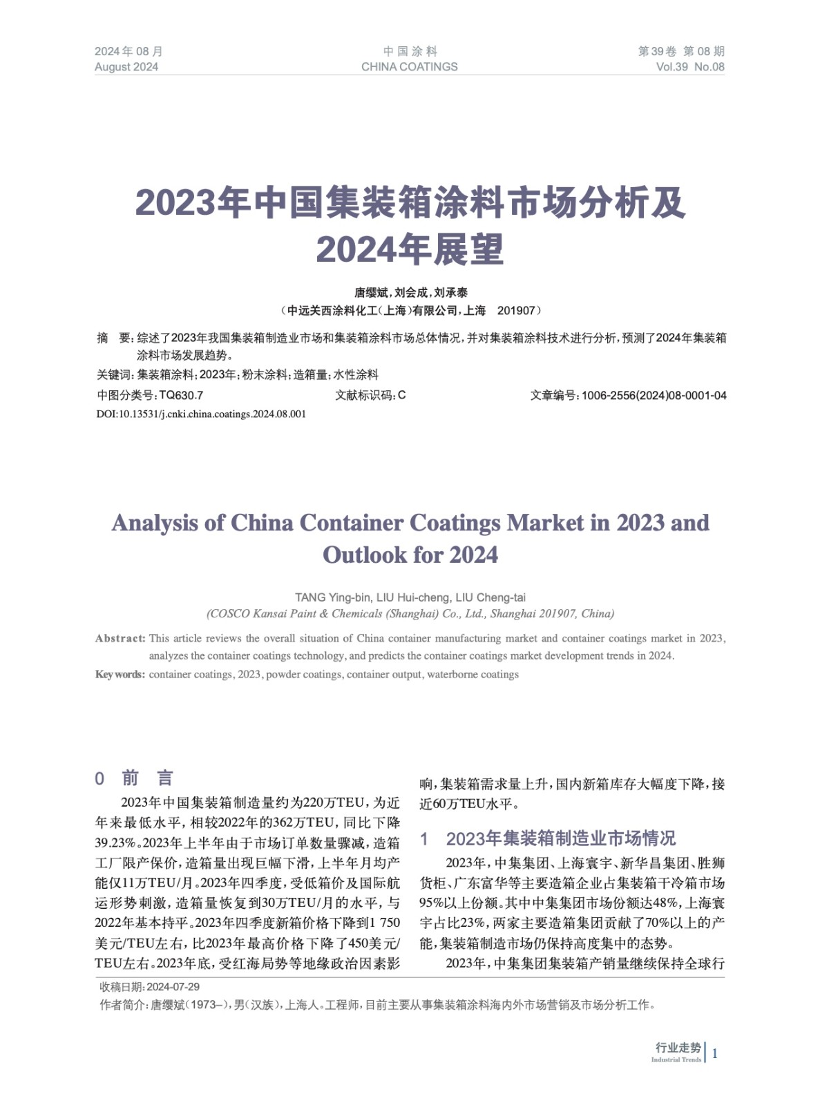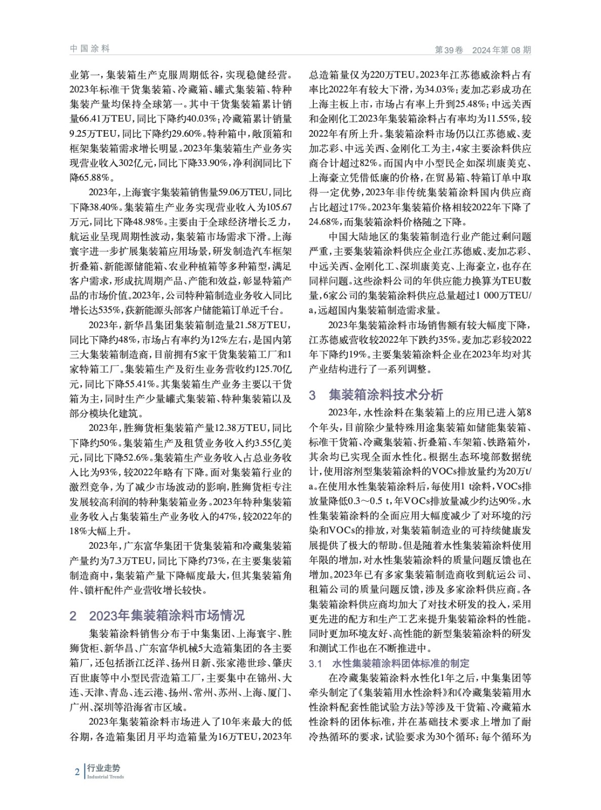 綜述了2023年我國集裝箱制造業(yè)市場和集裝箱涂料市場總體情況,并對集裝箱涂料技術進行分析,預測了2024年集裝箱涂料市場發(fā)展趨勢。