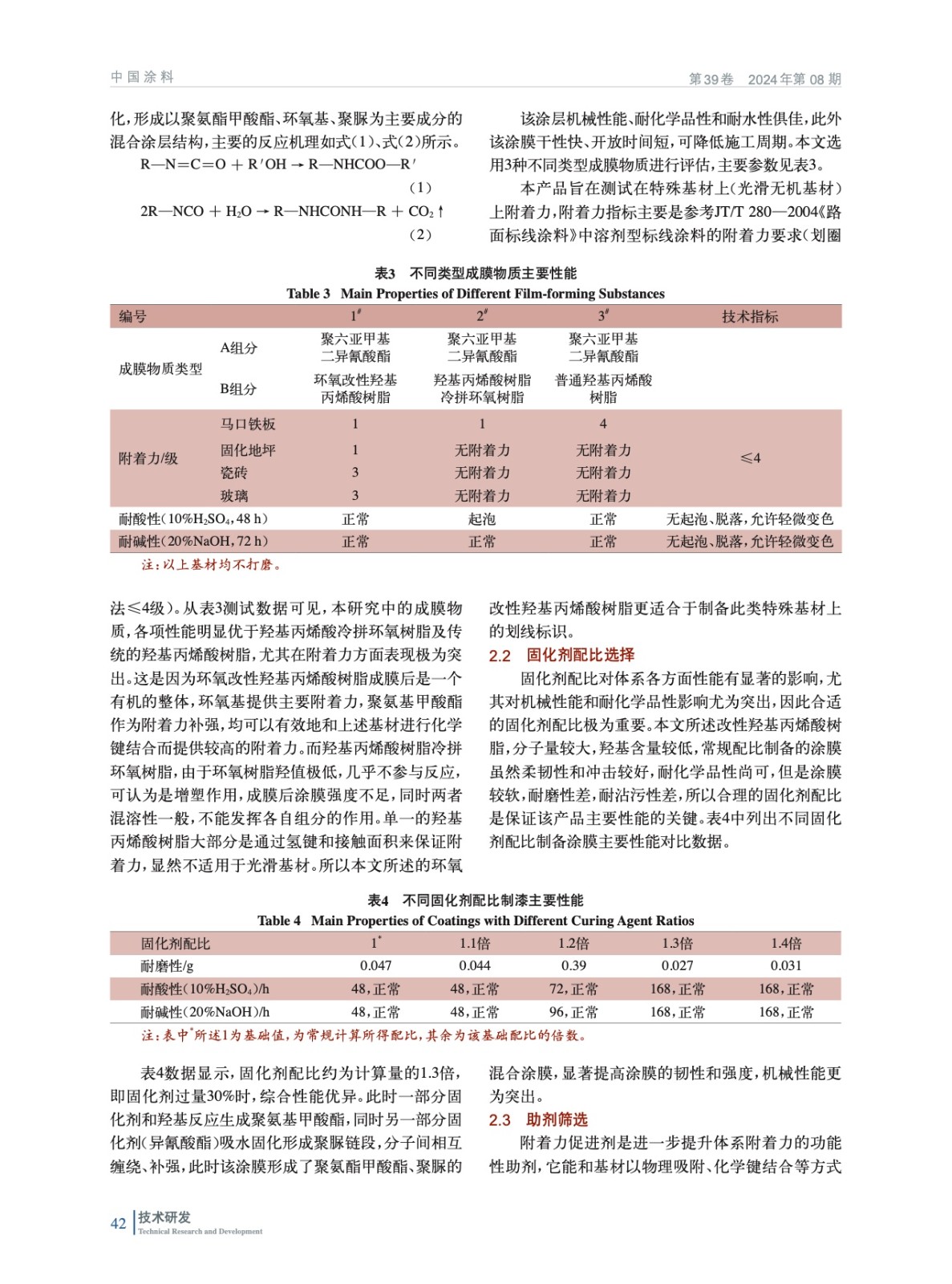 摘要:以改性羥基丙烯酸樹脂和聚六亞甲基二異氰酸酯固化劑為成膜物質,通過調整固化劑配比,改善涂膜機械性能和耐化學品性,優選附著力促進劑,制備一種在固化地坪、金剛砂地坪、瓷磚、玻璃等未經打磨的光滑基材上有優異附著力的標線涂料,該標線涂料綜合聚氨基甲酸酯、聚脲的優點,可廣泛用于上述基材的標線標識涂裝,具有極高的經濟效益。