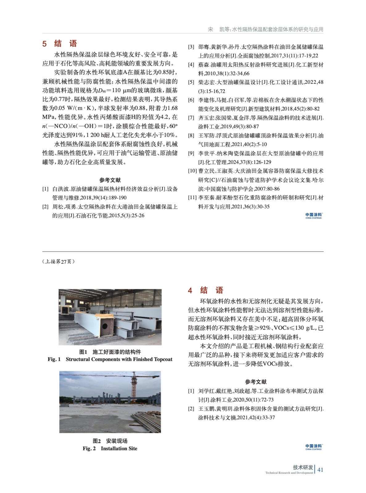 摘要:以“水性環氧底漆+水性隔熱保溫中間漆+水性丙烯酸面漆”構建隔熱保溫配套涂層體系。通過測試其耐腐蝕性、耐老化性、隔熱保溫等性能,對隔熱保溫配套涂層的性能進行評價。結果表明:水性環氧底漆A顏基比為0.85;水性隔熱保溫中間漆B選用規格為D90=110 μm的玻璃微珠,顏基比為0.77;水性丙烯酸面漆H羥值為4.2,n(—NCO)/n(—OH)=1時,涂層配套體系兼顧隔熱性能與耐腐蝕性,表現良好。