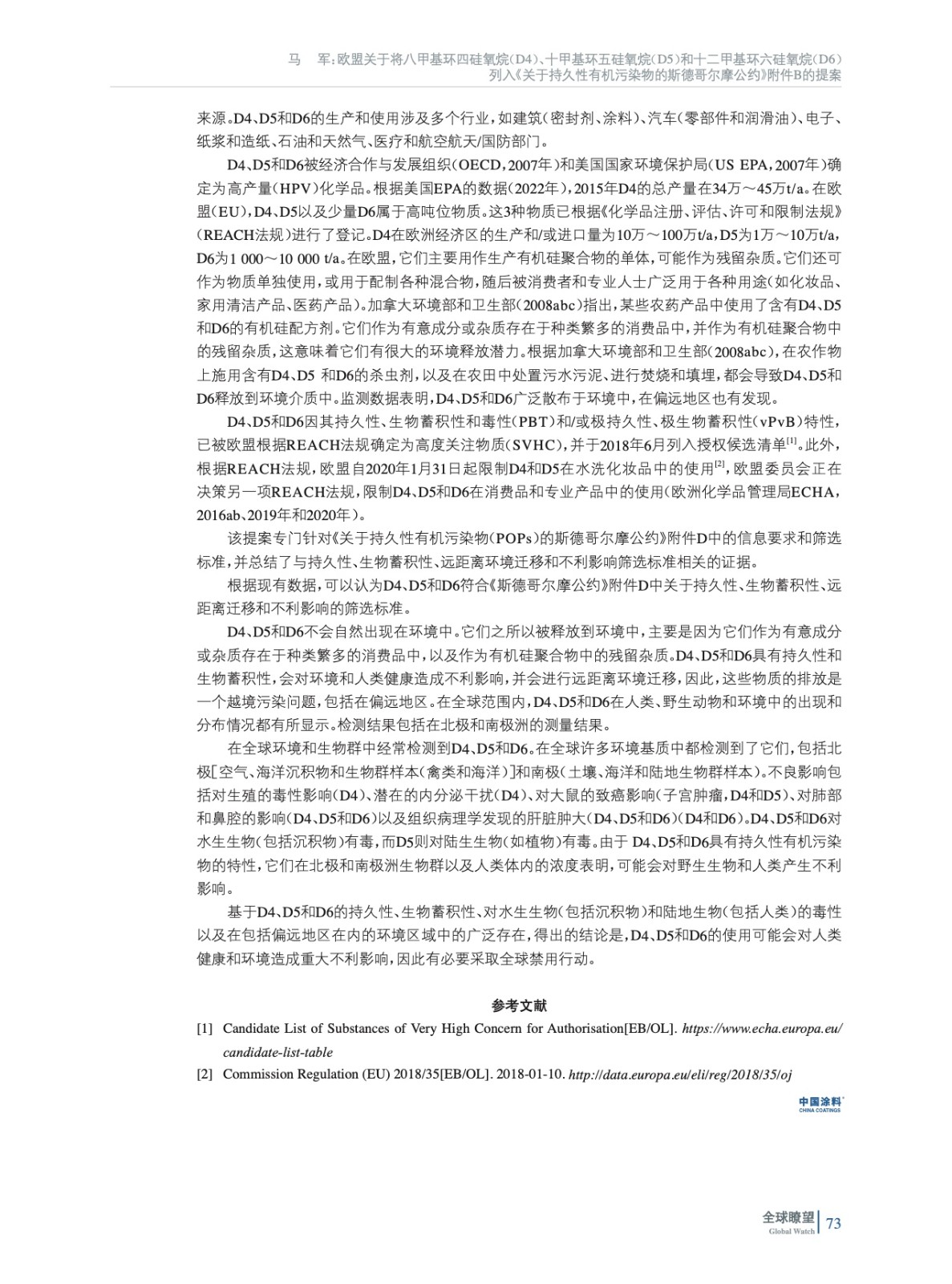 摘要:環(huán)硅氧烷D4、D5和D6化合物主要用作生產(chǎn)有機(jī)硅聚合物的單體,因其持久性、生物蓄積性和毒性(PBT)的特點(diǎn),已被歐盟根據(jù)REACH法規(guī)確定為高度關(guān)注物質(zhì)(SVHC),并于2018年6月列入授權(quán)候選清單[https://www.echa.europa.eu/candidate-list-table]。根據(jù)《關(guān)于持久性有機(jī)污染物(POPs)的斯德哥爾摩公約》附件D中的信息要求和篩選標(biāo)準(zhǔn),歐盟已經(jīng)開啟了增列D4、D5和D6化合物為POPs物質(zhì)管控的前期準(zhǔn)備工作。