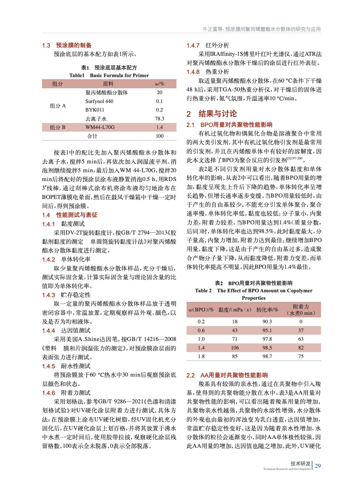 摘要:采用溶液聚合制備了一款預涂膜用聚丙烯酸酯水分散體,將其涂覆在聚酯薄膜表面得到預涂膜。研究了引發劑過氧化苯甲酰(BPO)用量、丙烯酸(AA)用量、中和度、不同交聯劑改性以及交聯溫度對聚丙烯酸酯水分散體性能的影響。結果表明:BPO用量為1.4%(質量分數,后同),AA用量8%,中和度80%,交聯劑WM44-L70G用量16%,交聯反應條件為130 ℃、5 min時,UV硬化涂層在預涂膜上的附著力最佳。