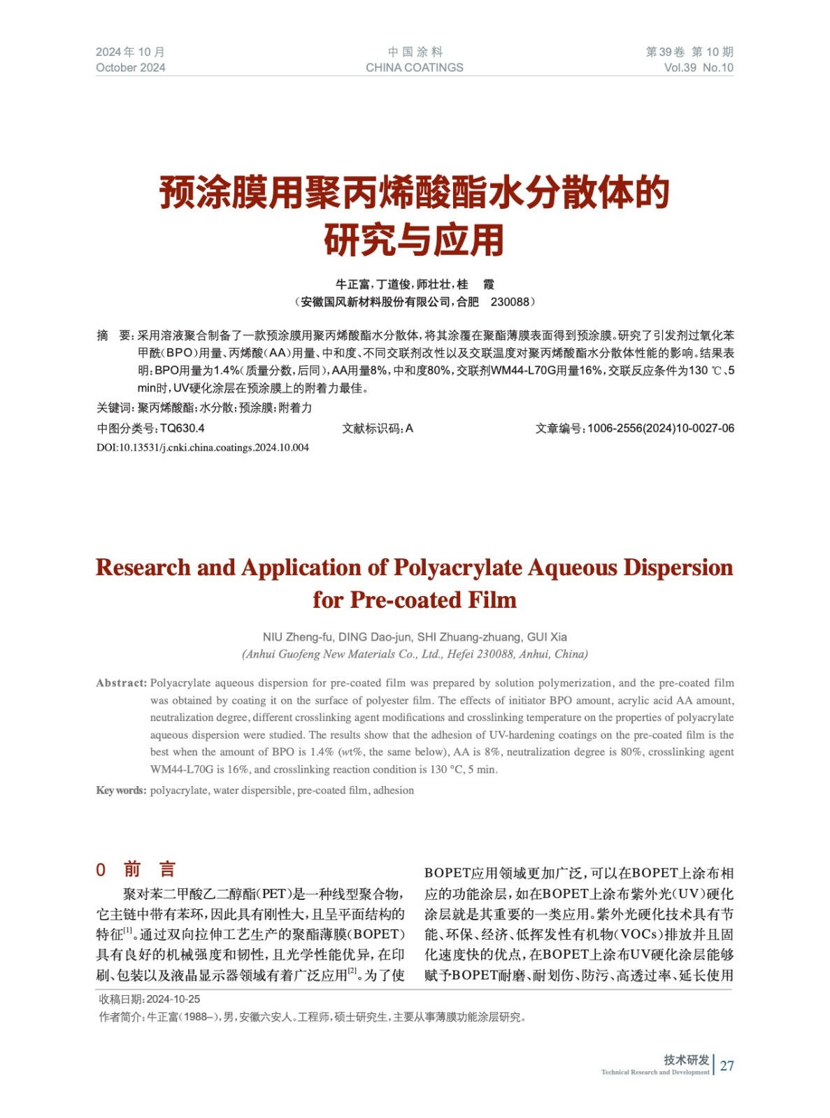 預涂膜用聚丙烯酸酯水分散體的研究與應用