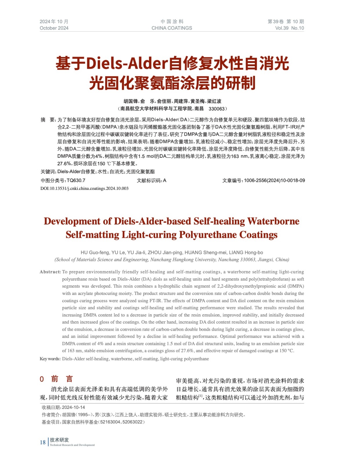 基于Diels-Alder自修復水性自消光光固化聚氨酯涂層的研制
