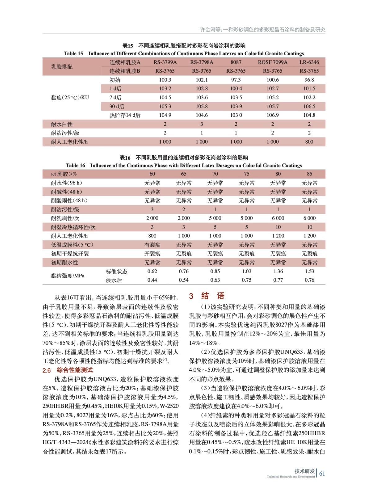 摘要:研發(fā)了一種彩砂調(diào)色的多彩冠晶石涂料,系統(tǒng)地研究了不同保護(hù)膠、纖維素、潤濕劑和乳膠的種類、用量對多彩冠晶石涂料的彩點展色性、施工韌性、質(zhì)感效果、耐水白性和耐人工老化性的影響。研究結(jié)果表明:保護(hù)膠為UNQ633,造粒保護(hù)膠溶液濃度在5%,造粒保護(hù)膠溶液占比為20%;基礎(chǔ)漆保護(hù)膠溶液濃度為10%,基礎(chǔ)漆保護(hù)膠溶液用量為4.5%,纖維素250HHBR用量為0.45%(質(zhì)量分?jǐn)?shù),后同),疏水改性纖維素HE10K用量為0.15%,潤濕劑W-2520的用量為0.2%,基礎(chǔ)漆乳膠8027用量為16%,彩點占比為60%;使用惰性乳膠RS-3798A和反應(yīng)型乳膠RS-3765作為連續(xù)相乳膠,其中RS-3765用量為25%、3798A用量為50%,連續(xù)相占比為20%。其制得的多彩冠晶石涂料在耐水白性、彩點展色性、彩點韌性、施工韌性、彩點質(zhì)感效果以及耐堿性、耐酸雨性、耐水性、耐洗刷性、耐濕冷熱循環(huán)性、耐人工老化性等方面均符合HG/T 4343—2024《水性多彩建筑涂料》的要求。彩砂作為調(diào)色的主要骨料,具備極高的耐候性和耐水性,無需添加水性色漿,克服了傳統(tǒng)多彩涂料因使用水性色漿調(diào)色而帶來的褪色、發(fā)花等質(zhì)量風(fēng)險。
