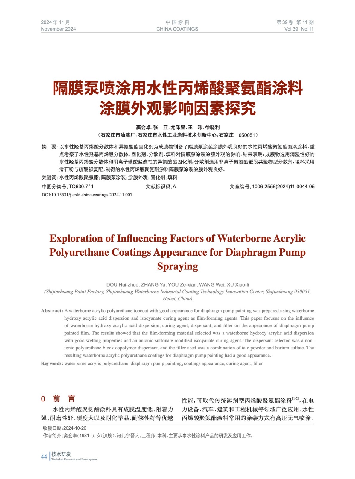 本文系作者@竇會卓,張 亞,尤澤顯,王 瑋,徐曉利 授權中國涂料網發表,并經中國涂料網編輯,未經允許不得轉載,如需轉載請聯系chinacoatingnet@vip.163.com