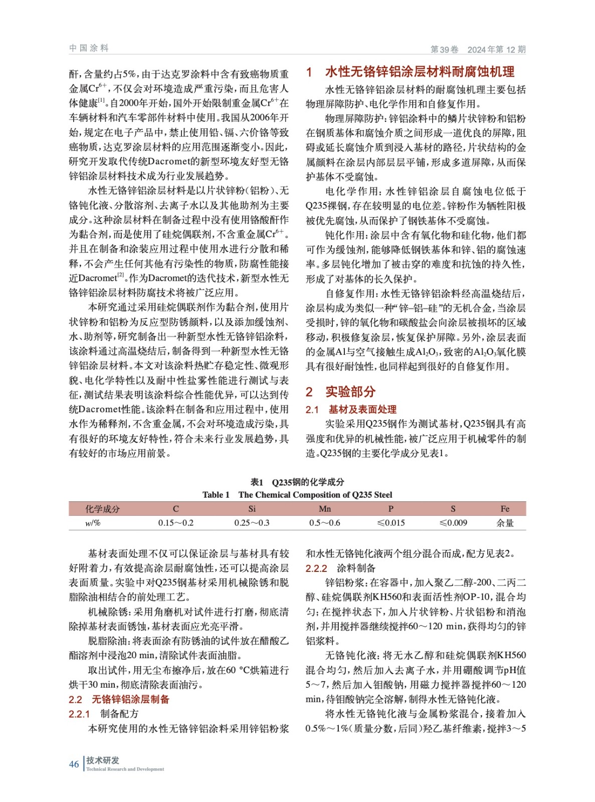 摘要:研究制備了一種水性無鉻鋅鋁涂料,并對涂料熱穩定性、微觀形貌、電化學性能及耐鹽霧性進行測試與表征。研究表明,該涂料經過高溫燒結后,涂層內部結構致密,片狀結構鋅粉和鋁粉在涂層內部層層相疊,形成多道屏障,延長腐蝕介質在涂層內部的滲透路徑。該涂料具有較好的熱穩定性,經過7 d熱穩定性測試,涂料的黏度和pH值均未發生明顯變化。涂層自腐蝕電位(-1.043 V)低于Q235祼鋼(-0.645 V),而且涂層自腐蝕電流(Icorr)4.82×10-6 A·cm-2比Q235祼鋼自腐蝕電流1.94×10-4 A·cm-2降低兩個數量級,腐蝕電阻從1.14×102 Ω增加到4.43×103 Ω,表明涂層的電化學腐蝕速率明顯降低,可以為基材提供陰極保護。涂層經過600 h中性鹽霧測試后,涂膜仍然保持較好的金屬光澤,表面有很輕微白銹產生。