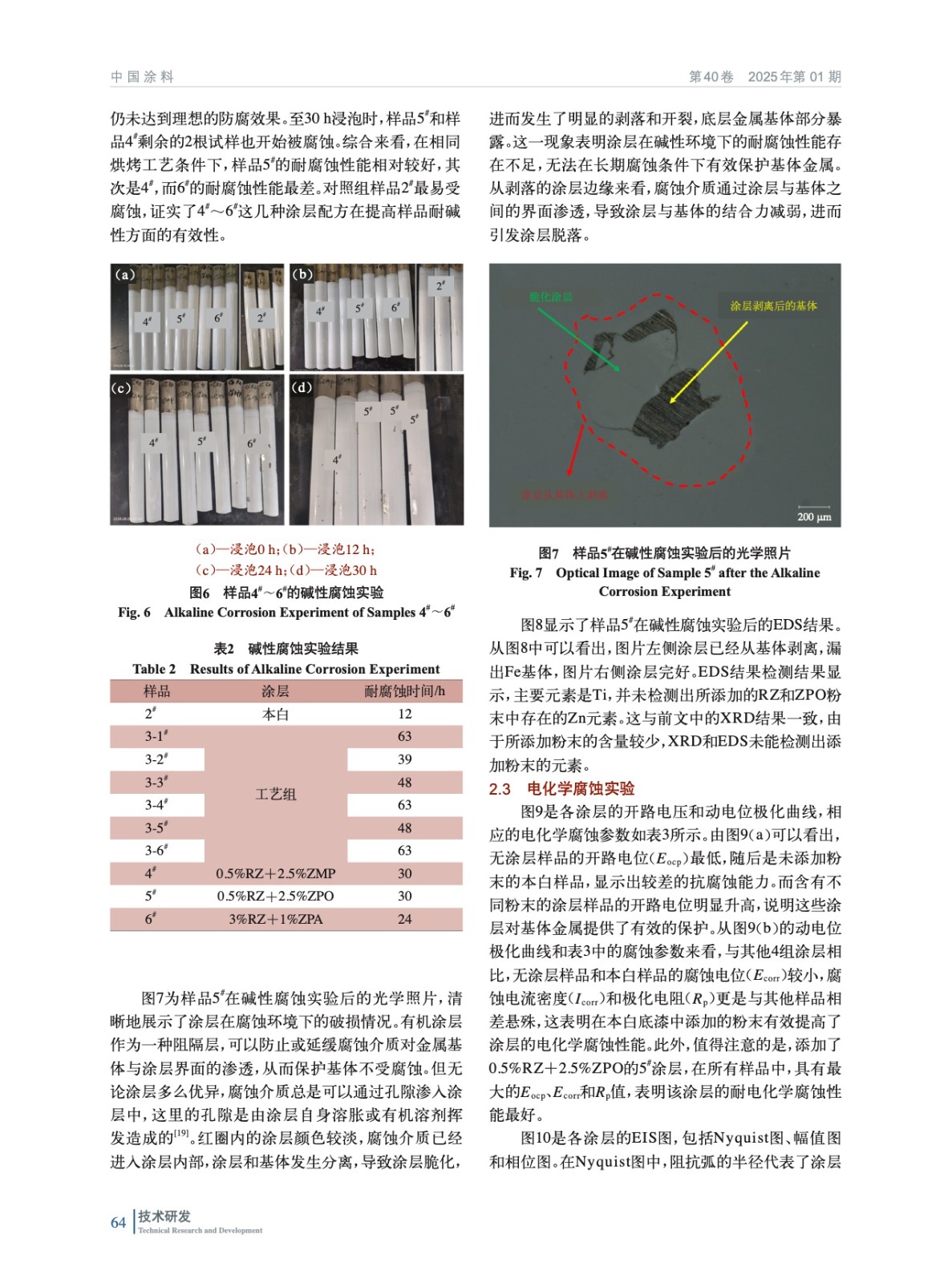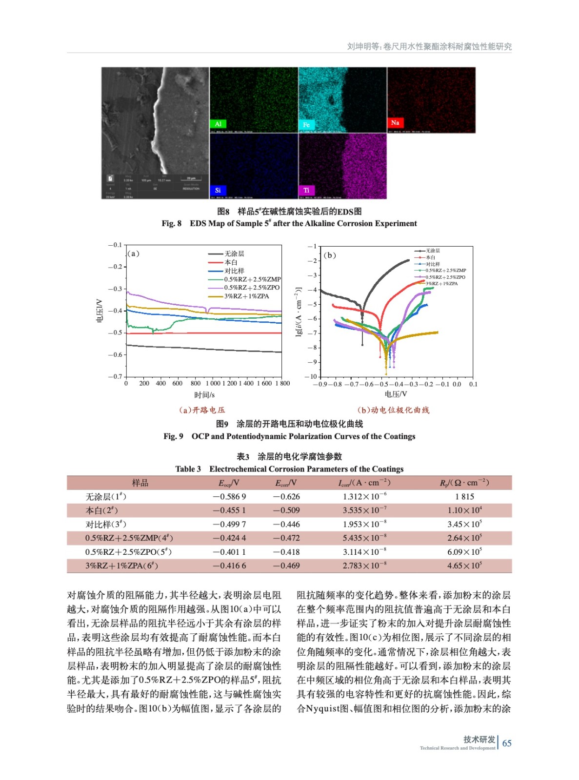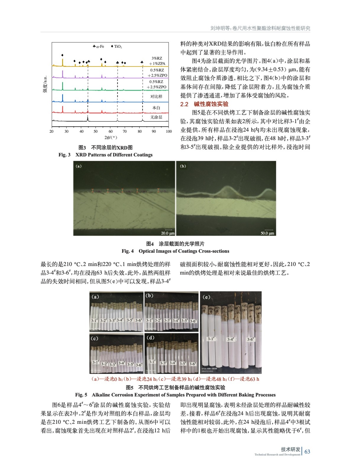 摘要:以水性聚酯涂料為底漆,研究了不同烘烤工藝對涂層耐堿性腐蝕的影響。在確定最佳烘烤工藝(210 ℃、2 min)后,實驗加入了多磷酸鉬鋅水合物(ZPA)、改性正磷酸鹽(ZMP)、有機改性磷酸鋅鋁鉬水合物(ZPO)、有機緩蝕劑(RZ)4種納米粉末,結合電化學測試和堿性腐蝕實驗,評估其對涂層耐腐蝕性能的影響。實驗結果表明,加入納米粉末后,涂層的耐腐蝕性能顯著提升,尤其是添加0.5%(質量分數,后同)RZ+2.5%ZPO的涂層表現出最佳的電化學耐腐蝕性能。該研究為開發(fā)高性能卷尺用聚酯涂層提供了有效的理論依據與實驗支持。