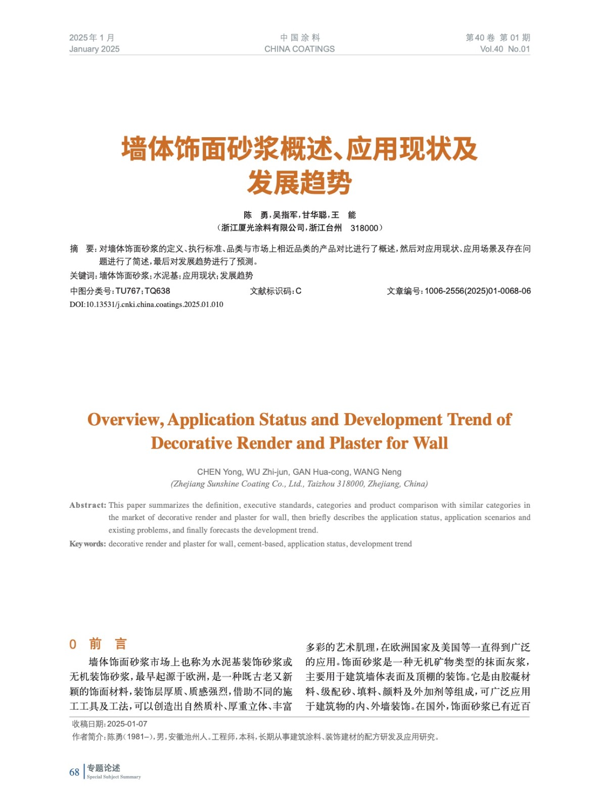 摘要:對墻體飾面砂漿的定義、執(zhí)行標準、品類與市場上相近品類的產(chǎn)品對比進行了概述,然后對應用現(xiàn)狀、應用場景及存在問題進行了簡述,最后對發(fā)展趨勢進行了預測。