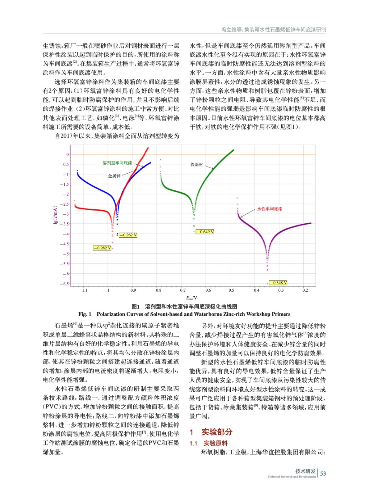 摘要:研制一款用于集裝箱的水性石墨烯低鋅車間底漆,使其性能與溶劑型車間底漆相當,并具有明顯的環境友好優勢。通過減少鋅含量的方法降低有害氣體濃度,保護人體健康安全。鋅含量降低導致電化學性能下降的問題,可通過調整鋅粉漆顏料體積濃度(PVC),同時添加一定量石墨烯的方法加以改善,使最終性能接近溶劑型車間底漆的水平,并滿足其臨時防腐的設計要求。將鋅粉漆配方的PVC調整至55%,鋅粉含量調整至50%(質量分數,后同),石墨烯加量0.7%,得到的車間底漆涂層的電極電位小于-0.8 V,經過35 ℃濕熱環境2周的測試,沒有出現銹蝕現象,通過了臨時防腐性能的測試要求。其配套涂層的耐鹽霧性能與溶劑型車間底漆相當,加速線擴蝕速度明顯減緩。在滿足其設計要求的基礎上實現了保護環境和人體健康安全的目的。