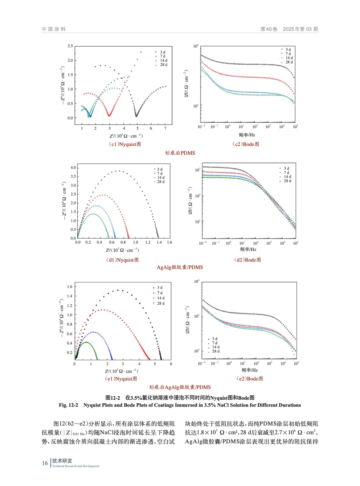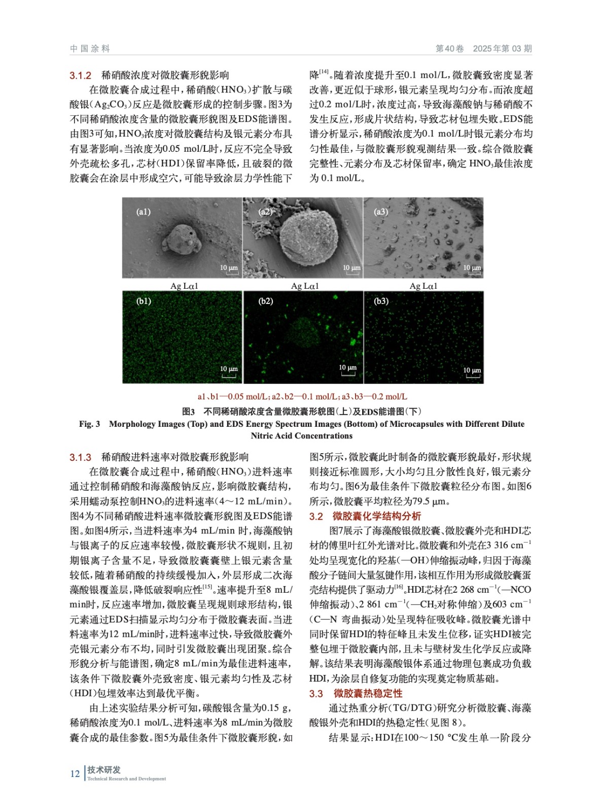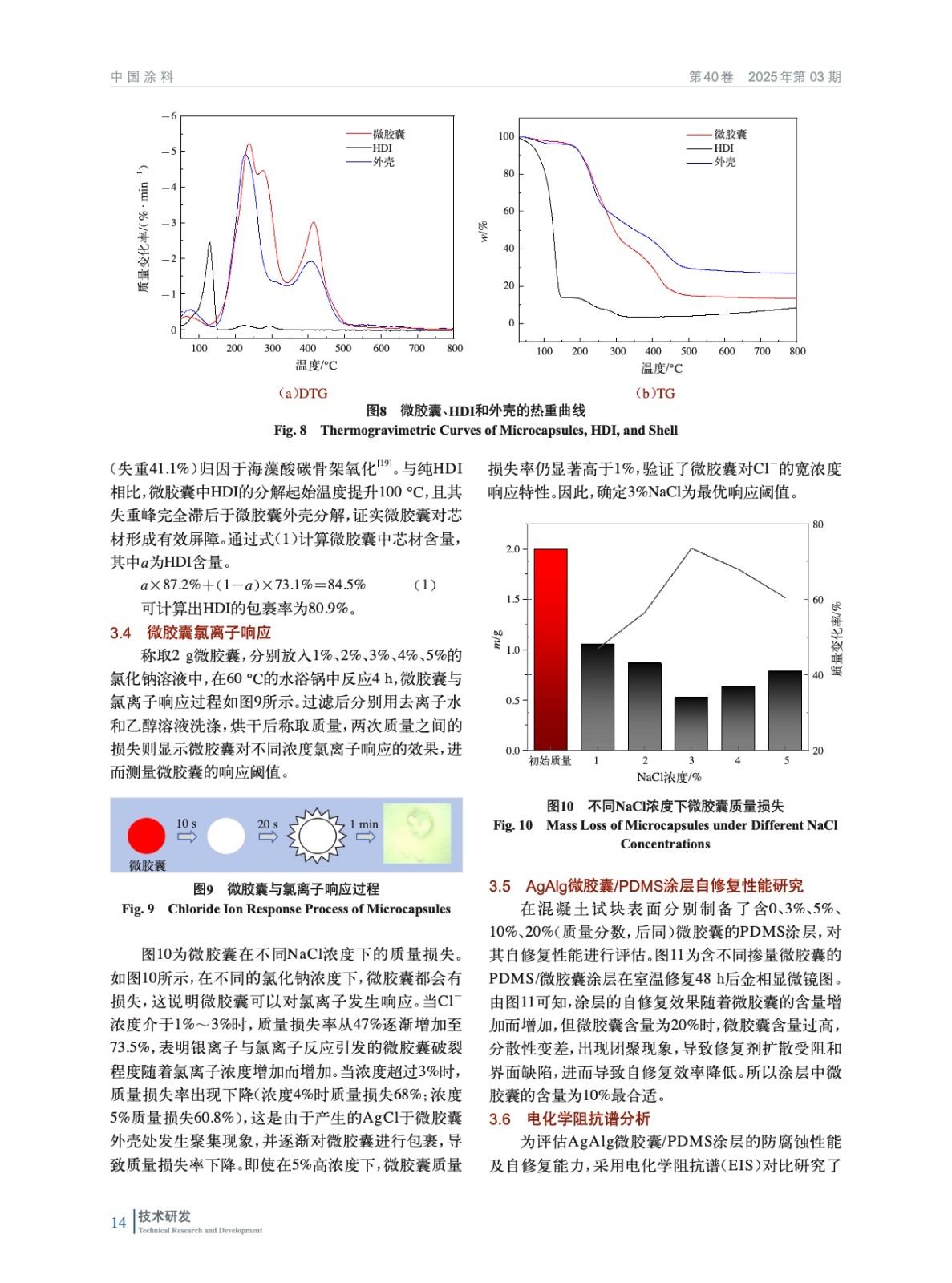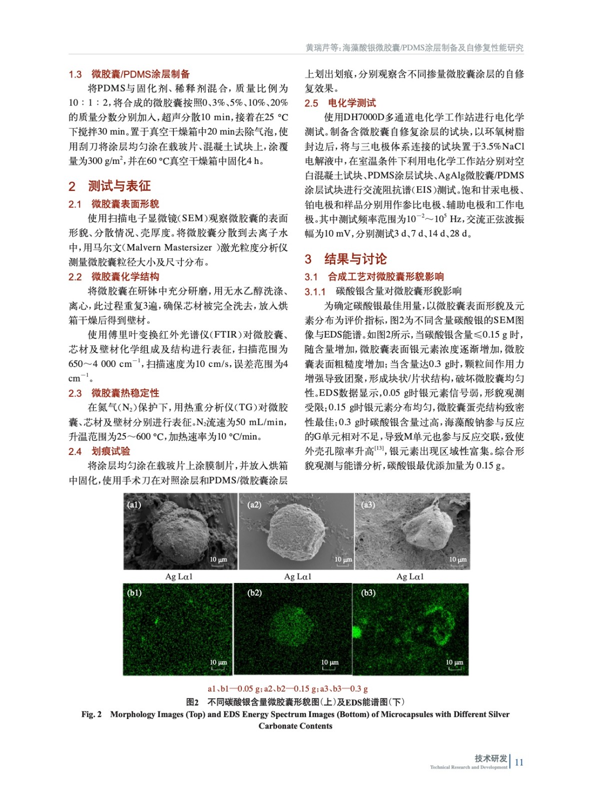 摘要:利用海藻酸鈉為壁材原料,六亞甲基二異氰酸酯為芯材原料,通過內(nèi)源乳化法制備海藻酸銀(AgAlg)微膠囊,通過控制不同碳酸銀含量和稀硝酸濃度、進料速度探討了微膠囊最佳合成工藝,對微膠囊形貌、化學結(jié)構(gòu)、熱穩(wěn)定性及芯材含量進行了研究,并通過微膠囊觸發(fā)微膠囊響應(yīng)氯離子濃度進行表征。將微膠囊加入PDMS涂層,制備AgAlg微膠囊/PDMS自修復涂層,對其進行劃痕試驗和電化學阻抗分析,通過與PDMS涂層相對比,結(jié)果表明氯離子響應(yīng)微膠囊具有較強的自修復能力。