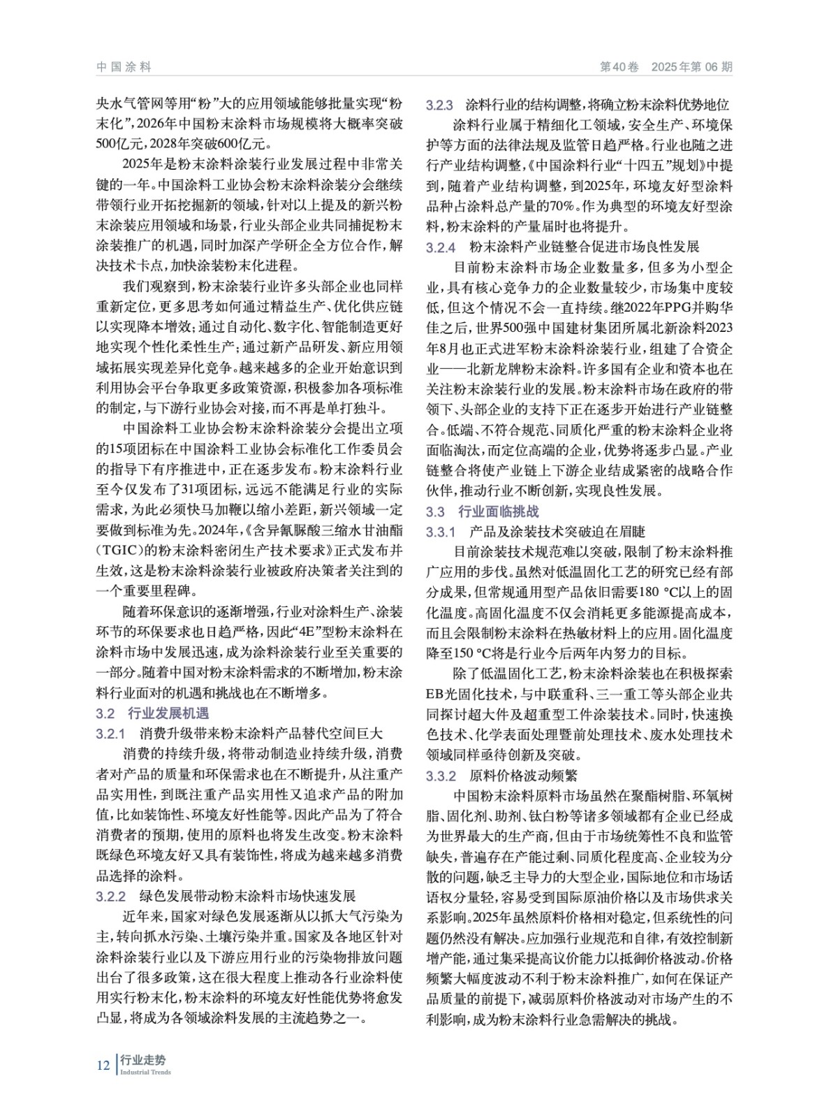 摘要:綜述了中國(guó)粉末涂料行業(yè)發(fā)展背景和動(dòng)力、當(dāng)前行業(yè)發(fā)展現(xiàn)狀,對(duì)2025–2029年粉末涂料市場(chǎng)規(guī)模、行業(yè)發(fā)展機(jī)遇和面臨的挑戰(zhàn)以及發(fā)展趨勢(shì)進(jìn)行了預(yù)測(cè),并對(duì)近年來粉末涂料行業(yè)相關(guān)政策、標(biāo)準(zhǔn)進(jìn)行了總結(jié)。